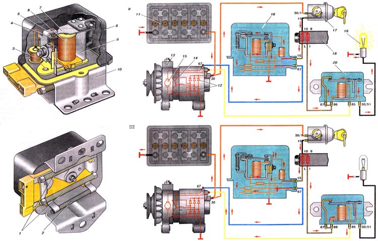 1. Термокомгюнмруюший резистор; 2. Дополнительные резисторы: 3. Дроссель: 4. Стойка с нижним контактом регулятора напряжения, 5. Стойка г. верхним контактом регулятора напряжения: 6. Пилотка регулятора напряжения; 7. Якорь регулятора напряжения; 8. Крышка регулятора напряжения; 9. Ярмо регулятора напряжения: 10. Основание регулятора напряжения; 11. Аккумуляторная батарея; 12. Выпрямитель генератора; 13. Генератор; 14. Обмотка статора генератора: 15. Обмотка ротора генератора; 16. Регулятор напряжения: 17. Выключатель зажигания; 18. Блок предохранителей; 19. Контрольная лампа заряда аккумуляторной батареи: 20. Реле контрольной лампы заряда аккумуляторной батареи; 21. I.Регулятор напряжения РР-380; 22. II.Работа при малой частоте вращения ротора генератора; 23. III.Работа при средней и высокой частоте вращения ротора генератора.