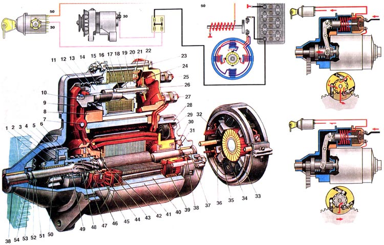 Для пуска двигателя применяется стартер СТ-221 мощностью 1,3 кВт, с электромагнитным включением шестерни привода, с роликовой обгонной муфтой и дистанционным управлением. С 1986 г. на автомобилях устанавливается взаимозаменяемый стартер 35.3708 с двухобмоточным тяговым реле и торцевым коллектором. Стартер СТ-221 представляет собой четырехшеточный, четырехполюсный электродвигатель постоянного тока со смешанным возбуждением и состоит из корпуса 41 с обмотками возбуждения, якоря с приводом, двух крышек 11 и 28 и тягового электромагнитного реле. Крышки и корпус стянуты в единое целое двумя шпильками, ввернутыми в крышку И. Внутри стального корпуса закреплены винтами четыре полюса 40. На полюсы надеты катушки обмотки. Корпус вместе с полюсами и катушками образует статор стартера. Две катушки обмотки статора являются сериесными, т.е. соединены с обмоткой якоря последовательно, а две другие шунтовыми, присоединенными параллельно обмотке якоря. Поэтому возбуждение стартера и называется смешанным. Оно обеспечивает сравнительно низкую частоту вращения якоря на холостом ходу без нагрузки, что уменьшает износ втулок подшипников вала якоря, облегчает условия работы обгонной муфты и предотвращает разнос якоря. Якорь стартера состоит из вала 37, сердечника с обмоткой 42 из медной ленты и коллектора 33, выполненного в виде пластмассовой втулки с залитыми в ней медными пластинами. Вал якоря вращается в двух металлокерамических втулках 38, запрессованных в крышки стартера и пропитанных маслом. Осевой свободный ход вала якоря регулируется подбором шайб 54 и должен быть в пределах 0,07-0.7 мм (у стартера 35.3708 - не более 0,5 мм). На переднем конце вала якоря установлен привод стартера, состоящий из роликовой обгонной муфты и шестерни 1. Назначение обгонной муфты - передавать крутящий момент от вала якоря стартера к венцу маховика при пуске двигателя, а после пуска, работая в режиме обгона, не допускать передачи крутящего момента от маховика на якорь. Иначе может произойти выброс обмотки якоря из пазов сердечника из-за "разноса" чрезмерно высокой частоты вращения якоря маховиком работающего двигателя. Обгонная муфта состоит из наружного кольца 5 с роликами 3 и внутреннего кольца, объединенного с шестерней 1 привода. Наружное кольцо имеет три паза с отверстиями, в которых находятся стальные ролики с пружинами, плунжерами и направляющими стержнями. Лазь для роликов - с переменной шириной. В широкой част* паза ролики могут свободно вращаться, а в узкой - заклиниваются между наружным и внутренним кольцами. Электромагнитное тяговое реле стартера служит для ввода шестерни привода в зацепление с венцом маховика и для замыкания цепи питания обмоток якоря и статора. Магнитную систему реле образуют фланцы 15 и 20, ярмо (окружающее обмотку) и сердечник 19, запрессованный во фланец 20. На каркасе из латунной трубки и пластмассовых щек намотана катушка реле. На стартерах выпуска 1981 г. имеется две обмотки: удерживающая и втягивающая. Обе обмотки намотаны в одну сторону. Начала обмоток припаяны к штекеру "50". Конец удерживающей обмотки приварен к фланцу 20 реле (т.е. соединен с "массой"), а конец втягивающей обмотки соединен с нижним контактным болтом 27 реле. Стартер 35.3708 отличается от стартера СТ-221 применением торцевого коллектора и обмотками статора. Торцевой коллектор выполнен в 