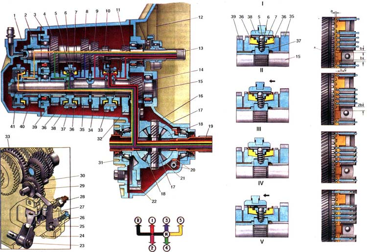 1. Задняя крышка; 2. Ведущая шестерня V передачи; 3. Картер коробки передач; 4. Ведущая шестерня IV передачи; 5. Шарик фиксатора; 6. Пружина фиксатора; 7. Сухарь фиксатора; 8. Ведущая шестерня III передачи; 9. Ведущая шестерня II передачи; 10. Ведущая шестерня заднего хода; 11. Ведущая шестерня I передачи; 12. Картер сцепления; 13. Первичный вал коробки передач; 14. Ведущая шестерня главной передачи; 15. Вторичный вал; 16. Ось сателлитов; 17. Сателлит; 18. Полуосевая шестерня; 19. Сальник полуоси; 20. Шестерня привода спидометра; 21. Коробка дифференциала; 22. Ведомая шестерня главной передачи; 23. Шток выбора передач; 24. Рычаг штока выбора передач; 25. Трехплечий рычаг выбора передач; 26. Фиксатор вилки заднего хода; 27. Вилка заднего хода; 28. Выключатель фонаря заднего хода; 29. Промежуточная шестерня заднего хода; 30. Ось промежуточной шестерни заднего хода; 31. Регулировочное кольцо; 32. Ведомая шестерня I передачи; 33. Скользящая муфта включения 1, II передач и заднего хода; 34. Ведомая шестерня II передачи; 35. Ведомая шестерня III передачи: 36. Блокирующее кольцо синхронизатора III и IV передач; 37. Ступица муфты синхронизатора III и IV передач; 38. Скользящая муфта синхронизатора III и IV передач; 39. Ведомая шестерня IV передачи; 40. Ведомая шестерня V передачи; 41. Скользящая муфта синхронизатора V передачи; 42. А выступ блокирующего кольца; а, в, с зазоры; 43. I.Схема работы синхронизатора; 44. II.Нейтральное положение; 45. III.Начало включения; 46. IV.передачи; 47. IV.Завершение выравнивания угловых скоростей шестерни 39 и вала 15; 48. V.Полное включение IV передачи.