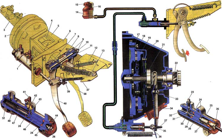 Для управления сцеплением на автомобиле ВАЗ-21213 применяется гидравлический привод с подвесной педалью и сервопружиной на педали, главным и рабочим гидравлическими цилиндрами, соединенными трубопроводом. Гидравлический привод сцепления обладает высоким коэффициентом полезного действия, простотой технического обслуживания и обеспечивает плавное включение сцепления, что снижает динамические нагрузки в трансмиссии и повышает комфортность езды на автомобиле. В гидравлической системе применяется тормозная жидкость "Роса" в количестве 0,19 л. Полный ход педали сцепления, намеренный по середине площадки педали, составляет 140 мм, а свободный - 25-35 мм. Педаль сцепления 40 установлена в кронштейне 6 педалей сцепления и тормоза на оси 10. На этой же оси крепится и педаль тормоза 38, между педалями установлена дистанционная втулка 8. Внутри ступицы педалей установлены внутренние втулки -11 и пластмассовые наружные втулки 9, которые в процессе эксплуатации не требуют смазки. Педаль сцепления 40 удерживается в исходном положении оттяжной пружиной 37 и прижимается к ограничительному винту 39 с резиновым буфером. С педалью шарнирно связан толкатель, сферический конец которого соприкасается с поршнем 45 главного цилиндра 1. Легкое соприкосновение толкателя с поршнем с зазором 0,1-0,5 мм соответствует ходу педали 0, 4-2 мм и регулируется винтом 39. Данный зазор позволяет при выключенном сцеплении поршню главного цилиндра 1 под действием пружины 47 упереться в стопорное кольцо 44, т.е. занять крайнее положение, при котором происходит сообщение рабочей полости главного цилиндра 1 с бачком 14 через перепускное отверстие. Сервопружина 13 соединяется с педалью 40 крючком 7; назначение сервопружины - уменьшать усилие, прикладываемое на педаль при выключении сцепления. Кронштейн 6 крепится к щитку передка кузова. К кронштейну 6 крепятся со стороны моторного отсека главный цилиндр 1 привода выключения сцепления и кронштейн 5 в сборе с вакуумным усилителем 2 и главным цилиндром 3 привода тормозов. Корпус 48 главного цилиндра привода выключения сцепления изготовлен из чугуна. Передняя сторона корпуса закрыта пробкой 32 с медной прокладкой, задняя сторона защищена от пыли и грязи резиновым колпачком 26. Сверху в одном из приливов корпуса 48 установлен штуцер 41 для соединения главного цилиндра с бачком 14 при помощи гибкого шланга; штуцер 41 уплотняется прокладкой 43 и крепится стопорной шайбой 42. В бачке 14 установлен резиновый отражатель 16 пробки 15. При понижении уровня жидкости давление воздуха над отражателем 16 устраняет возникающее в бачке разрежение, одновременно отражатель 16 защищает жидкость от засорения. В другом приливе корпуса 48 крепится металлическая трубка, являющаяся частью трубопровода, соединяющего главный и рабочий цилиндры привода выключения сцепления. Вторая часть трубопровода, соединяющего главный и рабочий цилиндры, выполнена из резинового гибкого шланга с металлическими наконечниками. Внутри корпуса 48 расположены поршни 45, 46 и пружина 47. Между поршнями находится уплотнитель 24, такая конструкция снижает радиальные нагрузки на поршень 46 при воздействии толкателя и позволяет предотвратить вытекание жидкости из цилиндра за счет сжатия уплотнительного кольца 24 поршнями 45 и 46. За поршнем 46 расположена рабочая полость цилиндра, на выходе соединен