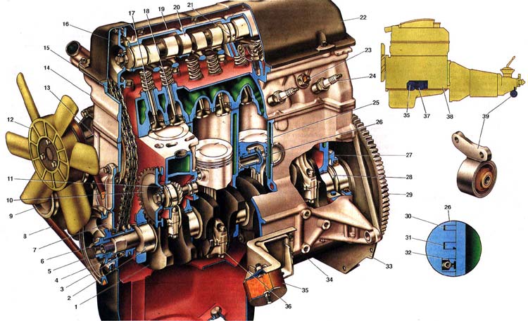 1. Коленчатый как; 2. Вкладыш кошенного подшипника коленчатою вала; 3. Звездочка коленчатого вала; 4. Передний сальник коленчатого вала; 5. Шкив коленчатого вала; 6. Храповик; 7. Крышка привода механизма газораспределения; 8. Ремень привода насоса охлаждающей жидкости и генератора; 9. Шкив генератора; 10. Звездочка привода масляного насоса, топливного насоса и распределителя зажигания; 11. Валик привода масляного насоса, топливного насоса и распределителя зажигания; 12. Вентилятор системы охлаждения; 13. Блок цилиндров; 14. Головка цилиндров: 15. Цепь привода механизма газораспределения; 16. Звездочка распределительного вала; 17. Выпускной клапан; 18. Впускной клапан; 19. Корпус подшипников распределительного вала; 20. Распределительный вал; 21. Рычаг привода клапана; 22. Крышка головки цилиндров; 23. Датчик указателя температуры охлаждающей жидкости; 24. Свеча зажигания; 25. Поршень; 26. Поршневой палец; 27. Держатель заднего сальника коленчатою вала; 28. Упорное полукольцо коленчатого вала; 29. Маховик; 30. Верхнее компрессионное кольцо; 31. Нижнее компрессионное кольцо: 32. Маслосъемное кольцо: 33. Передняя крышка картера сцепления; 34. Масляный картер; 35. Передняя опора силового агрегата; 36. Шатун; 37. Кронштейн передней опоры: 38. Силовой агрегат: 39. Задняя опора силового агрегата.