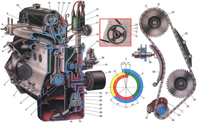 1. Крышка шатуна; 2. Вкладыш шатуна; 3. Шатун; 4. Стартер; 5. Теплоизолируюший щиток стартера; 6. Выпускной коллектор; 7. Дренажная трубка впускной трубы; 8. Впускная труба: 9. Маслоотражательный колпачок; 10. Сухарь клапана; 11. Тарелка пружин; 12. Пружина рычага привода клапана; 13. Рычаг привода клапана: 14. Регулировочный болт клапана; 15. Распределитель зажигания; 16. Втулка регулировочного болта; 17. Направляющая втулка клапана; 18. Седло клапана; 19. Валик привода масляного насоса, топливного насоса и распределителя зажигания, 20. Топливный насос; 21. Шестерня привода масляного насоса, топливного насоса и распределителя зажигания; 22. Масляный фильтр; 23. Валик масляного насоса; 24. Корпус масляного насоса; 25. Ось ведомой шестерни масляного насоса; 26. Ведущая шестерня масляного насоса: 27. Крышка масляного насоса: 28. Пружина редукционного клапана: 29. Редукционный клапан масляного насоса; 30. Ведомая шестерня масляного насоса; 31. Приемный патрубок масляного насоса: 32. Звездочка распределительного вала; 33. Успокоитель цепи; 34. Звездочка привода масляного насоса, датчика-распределителя зажигания и топливного насоса: 35. Цепь привода механизма газораспределения; 36. Звездочка коленчатого вала; 37. Ограничительный палец цепи: 38. Башмак натяжителя; 39. Натяжитель: 40. А.Установочный выступ на корпусе подшипников распределительного вала: 41. В.Установочная метка на звездочке распределительного вала; 42. С.Установочная метка на блоке цилиндров: 43. D.Установочная метка на звездочке коленчатого вала: 44. Е.Метка ВМТ на шкиве коленчатого вала; 45. F.Метка опережения зажигания на О': 46. G.Метка опережения зажигания на 5'; 47. Н.Метка опережения зажигания на 10'; 48. I.Диафрагма фаз газораспределителя: а впуск горючей смеси: Ь сжатие: с рабочий ход; d выпуск.