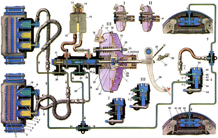 1. Тормозные колодки: 2. Ось прижимного рычага; 3. Направляющая колодок; 4. Прижимной рычаг суппорта; 5. Суппорт тормоза; 6. Уплотнительное кольцо поршня; 7. Поршни колесных цилиндров первичного контура: 8. Тормозной шланг вторичного контура; 9. Блок цилиндров; 10. Тормозной диск; 11. Поршень привода первичного контура главного цилиндра; 12. Бачок гидропривода тормозов; 13. Подвижный контакт; 14. Неподвижный контакт; 15. Поплавок; 16. Вакуумный клапан; 17. Корпус клапана вакуумного усилителя; 18. Диафрагма; 19. Шпилька усилителя; 20. Буфер штока; 21. Крышка корпуса усилителя: 22. Клапан вакуумного усилителя; 23. Возвратная пружина корпуса клапана; 24. Толкатель клапана; 25. Оттяжная пружина педали; 26. Выключатель стоп-сигнала; 27. Наконечник выключателя стоп-сигнала; 28. Педаль тормоза; 29. Пружина клапана; 30. Поршень; 31. Возвратная пружина корпуса клапана: 32. Шток; 33. Уплотнитель штока; 34. Уплотнительное кольцо; 35. Ограничительный винт хода поршня: 36. Втулка; 37. Поршень привода вторичного контура; 38. Уплотнитель; 39. Трубопровод вторичного контура; 40. Тормозные колодки: 41. Поршень колесного цилиндра; 42. Уплотнитель поршня: 43. Упорные кольца: 44. Рычаг привода регулятора давления; 45. Уплотнительное кольцо: 46. Тарелка пружины; 47. Уплотнитель головки поршня: 48. Втулка корпуса; 49. Поршень регулятора давления; 50. Пробка корпуса регулятора давления; 51. А-Вакуумная полость; 52. В-Канал, соединяющий атмосферную полость с внутренней полостью корпуса клапана; 53. С-Канал, соединяющий внутреннюю полость корпуса клапана с вакуумной полостью: 54. D-Атмосферная полость: 55. К-Квпускной трубе двигателя: 56. I.Педаль не нажата; 57. II.Растормаживание; 58. III.Торможение.