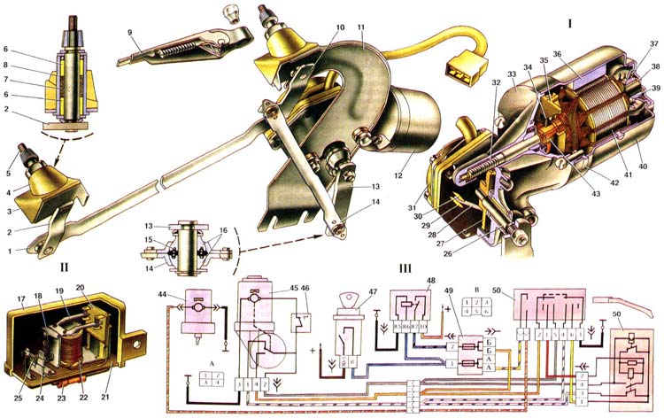 На автомобилях ВАЗ-21213 применяется электрический очиститель ветрового стекла с параллельным движением щеток. Он состоит из рычажного механизма, щеток с рычагами и моторедуктора 12. Вращение кривошипа 13 тягой 14 преобразуется в качание поводков 2 и 10, связанных тягой 1. Частота качания рычагов составляет 50-70 двойных ходов в минуту. Оси поводков вращаются каждая в двух металлокерамических втулках 6, разделенных войлочной вставкой 7. Втулки и войлок пропитаны маслом. Тяги 1 и 14 соединяются с поводками и кривошипом сферическими шарнирами, в которых находятся по два полусферических металлокерамических вкладыша 16, пропитанных маслом, которым также заполнено и пространство между вкладышами. Моторедуктор состоит из электродвигателя с возбуждением от постоянных магнитов и червячного редуктора. Электродвигатель имеет стальной корпус 40, внутри которого пружинными держателями закреплены два постоянных магнита 36, образующие вместе с корпусом статор. Вал якоря вращается в двух металлокерамических втулках, закрепленных стальными обоймами одна в корпусе, а другая в крышке 33. Вокруг втулок помещены войлочные кольца 37, пропитанные маслом. Осевое усилие, действующее на вал якоря от червячной передачи, воспринимается текстолитовым подпятником 38, в который упирается задний конец вала. Осевой свободный ход вала регулируется подбором шайб, устанавливаемых между коллектором и передней втулкой вала якоря. Корпус электродвигателя закрывается крышкой 33, являющейся одновременно картером редуктора. Крышка отлита из алюминиевого сплава и крепится к корпусу двумя винтами. С внутренней стороны к крышке приклепан пластмассовый щеткодержатель 35 с двумя щетками, а с наружной (в картере редуктора) находится пластмассовая червячная шестерня 27 с кулачком. Шестерня напрессована на ось 26, которая вращается в металлокерамической втулке, запрессованной в крышку 33. Передаточное отношение редуктора составляет 51:1. Картер редуктора закрывается пластмассовой панелью и крышкой 31. В панели находятся контактные стойки, к которым припаиваются провода и крепится пружинная пластина 28 с контактами выключателя, обеспечивающего остановку электродвигателя в тот момент, когда щетки находятся в нижнем положении. Контакты пружинной пластины прижимаются к стойке 30, соединенной с источником питания. Когда выступ кулачка шестерни находится против пластины, он отжимает ее от стойки 30 и прижимает к стойке 29, соединенной с "массой". В очистителе устанавливается термобиметаллический предохранитель 46 многоразового действия, который защищает цепь питания обмотки якоря электродвигателя от перегрузок при заедании механизма очистителя или примерзании щеток к стеклу. Реле очистителя ветрового стекла. Для получения прерывистой работы очистителя применяется реле типа РС-514. Оно устанавливается под панелью приборов с левой стороны. На сердечнике в пластмассовом каркасе находится обмотка 22 сопротивлением 66 Ом. На пластмассовой опоре 20 расположены две пары неподвижных контактов. Верхняя пара контактов является нормально замкнутой. При срабатывании реле верхняя пара контактов размыкается, а нижняя замыкается. Прерыватель состоит из биметаллической пластинки 25 с обмоткой из нихромовой проволоки. Работа очистителя Рычаг переключателя очистителя расположен с правой стор