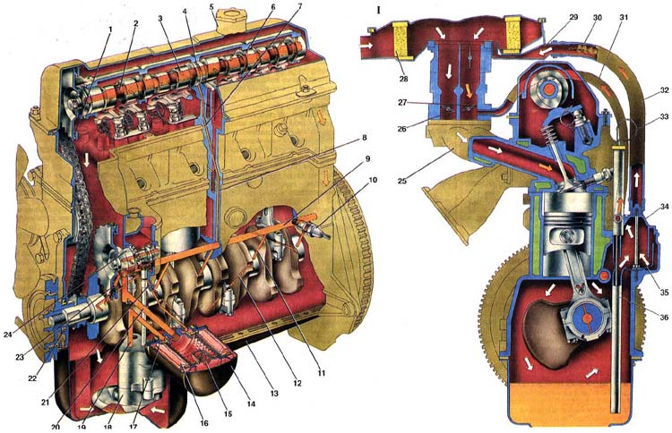 Система смазки комбинированная: под давлением и разбрызгиванием. Под давлением смазываются коренные и шатунные подшипники, опоры распределительного вала, подшипники вала привода масляного насоса и распределителя зажигания, кулачки распределительного вала и втулка шестерни привода масляного насоса и распределителя зажигания. Маслом, вытекающим из зазоров и разбрызгиваемым движущимися деталями, смазываются стенки цилиндров, поршни с поршневыми кольцами, поршневые пальцы в бобышках поршня, цепь привода механизма газораспределения, опоры рычагов привода клапанов, а также стержни клапанов в их направляющих втулках. Вместимость системы смазки 3,75 л. В систему смазки входят: масляный насос 18, приемный патрубок с фильтрующей сеткой, прикрепленный к корпусу насоса, полнопоточный масляный фильтр, установленный на левой передней стороне двигателя, редукционный клапан давления масла, встроенный в приемный патрубок, электрический датчик 10 недостаточного давления масла. Датчик недостаточного давления масла соединен с сигнальной лампой на щитке приборов, которая загорается при падении давления масла до 0,02-0,06 МПа (0,2-0,6 кгс/см2). При работе двигателя с исправной системой смазки лампа должна гаснуть (если двигатель не перегрет). Циркуляция масла при работе двигателя происходит следующим образом. Масляный насос 18, приводимый в действие парой шестерен со спиральными зубьями, засасывает масло из картера 13 через фильтрующую сетку маслоприемного патрубка и подает его по каналу 19 в полнопоточный фильтр. Отфильтрованное масло по каналу 20 попадает в магистральный масляный канал 9, проходящий вдоль блока с левой стороны, а оттуда по каналам 23 и 11, просверленным в блоке цилиндров, проникает к коренным подшипникам коленчатого вала и переднему подшипнику валика 24 привода масляного насоса и распределителя зажигания. К центральной опоре распределительного вала масло подводится по каналам 7, просверленным в блоке цилиндров, в головке и в корпусе подшипников распределительного вала. Масло, подошедшее к центральной опоре распределительного вала через канавку в опорной шейке, попадает в центральный канал распределительного вала, а из канала через отверстия в кулачках и в опорных шейках - к кулачкам, рычагам и опорам вала. Масло от первого подшипника валика 24 привода масляного насоса и распределителя зажигания поступает ко второму подшипнику по каналу, просверленному в самом валике. К втулке шестерни привода масляного насоса и распределителя зажигания масло подводится по отдельному каналу 21 из полости блока перед масляным фильтром. Остальные детали смазываются разбрызгиванием и самотеком. Цепь механизма газораспределения смазывается маслом, которое выходит из передней опоры распределительного вала и передней втулки вала привода масляного насоса и распределителя зажигания, и затем разбрызгивается через радиальные каналы 1 на звездочках указанных валов. Для того чтобы при работе двигателя на любом режиме обеспечить необходимое давление масла в магистрали, а также чтобы компенсировать увеличивающийся при износе двигателя расход масла, масляный насос имеет избыточную производительность. Для предотвращения повышения давления масла сверх допустимого в системе установлен редукционный клапан, перепускающий избыточное масло в масло