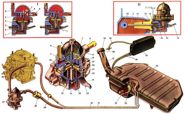 Система питания автомобилей ВАЗ-21213 включает приборы подачи топлива и воздуха, приготовления горючей смеси и выпуска отработавших газов. Система питания состоит из топливного бака 34. топливного насоса 27, топливопроводов, воздушного фильтра, карбюратора 26, глушителей и трубопроводов. Система с обратным сливом части топлива от карбюратора 26 через калиброванное отверстие патрубка карбюратора в топливный бак. На шланге слива топлива крепится обратный клапан 29, не допускающий слива топлива из бака через карбюратор. Топливный бак 34 стальной, штампованный, сварной. Вместимость топливного бака 45 л, включая резерв 4-6,5 л. Бак устанавливается внутри кузова под задним сиденьем, отделен от салона специальной перегородкой и крепится к полу кузова четырьмя болтами. Наливная труба бака выведена в нишу, расположенную с правой стороны автомобиля и закрываемую люком. Наливная труба соединяется с приемной трубой топливного бака резиновым соединительным шлангом, закрепленным с помощью двух хомутов, и закрывается глухой резьбовой пробкой. Топливный бак 34 имеет сепаратор 35 паров бензина, который соединительными шлангами 36 подсоединяется к баку, а вентиляционным шлангом 40 соединяется с атмосферой. Пары бензина, конденсируясь в сепараторе, поступают обратно в топливный бак. На фланце верхней половины бака через резиновую прокладку крепится датчик 33 указателя уровня топлива в сборе с топливоприемной трубкой, снабженной сетчатым фильтром. Датчик соединен с прибором, установленным на щитке приборов и снабженным красной лампой резерва, которая загорается, когда в баке остается 4-6,5 л. Применяемый бензин АИ-ЭЗ. Топливопроводы. Топливо от топливного бака к топливному насосу подается по стальному освинцован- ному или оцинкованному двухслойному трубопроводу 31. Между собой трубопровод 31 и патрубки приборов системы соединены резиновыми шлангами в тканевой оплетке и закреплены стяжными хомутами. На кузове топливные трубопроводы закреплены пластмассовыми держателями, отверстия для их прохода загерметизированы резиновыми заглушками. Топливный насос 27 диафрагменного типа, с механическим приводом; установлен на левой стороне блока цилиндров, закреплен на двух шпильках через теплоизоляционную проставку 11 и регулировочные прокладки 12 и 13; снабжен рычагом 14 ручной подкачки топлива. Привод топливного насоса осуществляется от эксцентрика 10 валика привода масляного насоса и распределителя зажигания через толкатель 3. Насос состоит из нижнего корпуса 4 с рычагами привода, верхнего корпуса 25 с клапанами и патрубками, диафрагменного узла и крышки 17. Диафрагменный узел имеет три диафрагмы: две верхние 20 рабочие для подачи топлива, одну нижнюю 21 предохранительную, работающую в контакте с картерным маслом и предохраняющую попадание топлива в картер двигателя при повреждении рабочих диафрагм. Между рабочими и предохранительной диафрагмами установлены дистанционные наружная 22 и внутренняя 19 прокладки. Наружная прокладка имеет отверстие для выхода топлива наружу при повреждениях рабочих диафрагм. Диафрагмы с тарелками и с внутренней дистанционной прокладкой 19 установлены на шток 24 и закреплены сверху гайкой. Диафрагменный узел установлен между верхним и нижним корпусами насоса и закреплен винтами. Поддиафрагменный узел на шток установлена сжат