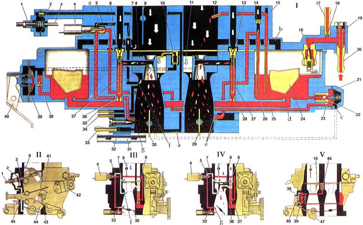 1. Регулировочный винт пускового устройства; 2. Диафрагма пускового устройства; 3. Шток пускового устройства; 4. Электромагнитный запорный клапан; 5. Топливный жиклер холостого хода; 6. Главный воздушный жиклер первой камеры; 7. Воздушный жиклер холостого хода; 8. Распылитель главной дозирующей системы первой камеры; 9. Воздушная заслонка; 10. Распылитель ускорительного насоса: 11. Распылитель главной дозирующей системы второй камеры; 12. Впрыскивающая трубка эконостата; 13. Главный воздушный жиклер второй камеры; 14. Воздушный жиклер переходной системы второй камеры; 15. Крышка карбюратора; 16. Игольчатый клапан; 17. Патрубок слива топлива в бак; 18. Жиклер перепуска топлива в бак; 19. Топливный фильтр; 20. Патрубок подачи топлива в карбюратор; 21. Диафрагма экономайзера мощност- ныи ражимов; 22. Шариковый клапан экономайзера мощностных режимов; 23. Топливный жиклер экономайзера мощност- ных режимов; 24. Поплавок; 25. Топливный жиклер эконостата с трубкой; 26. Топливный жиклер переходной системы 2-й камеры с трубкой; 27. Эмульсионная трубка второй камеры; 28. Главный топливный жиклер второй камеры; 29. Дроссельная заслонка второй камеры; 30. Дроссельная заслонка первой камеры; 31. Блок подогрева карбюратора; 32. Регулировочный винт качества смеси холостого хода; 33. Патрубок отсоса картерных газов; 34. Патрубок отбора разрежения к вакуумному регулятору распределителя зажигания; 35. Патрубок отбора разрежения к клапану рециркуляции (второй патрубок условно не показан); 36. Главный топливный жиклер первой камеры; 37. Эмульсионная трубка первой камеры; 38. Обратный шариковый клапан ускорительного насоса; 39. Диафрагма ускорительного насоса; 40. Рычаг привода ускорительного насоса; 41. Тяга привода воздушной заслонки; 42. Кронштейн крепления оболочки тяги; 43. Регулировочный винт приоткры- вания дроссельной заслонки первой камеры; 44. Рычаг привода дроссельных заслонок; 45. Рычаг управления воздушной заслонкой; 46. Шариковый клапан подачи топлива; 47. ок привода насоса; 48. а.Воздушный канал пускового устройства; 49. в.Канал балансировки поплавковой камеры; 50. с.Воздушный канал экономайзера мощностных режимов; 51. d.Топливный канал экономайзера мощностных режимов; 52. е.Выходные отверстия переходной системы второй камеры; 53. f.Отверстие воздушного канала холостого хода; 54. g.Отверстия воздушных каналов системы холостого хода; 55. h.Отверстие переходной системы первой камеры; 56. I.Схема работы карбюратора на режиме полной нагрузки; 57. II.Схема работы пускового устройства; 58. III.Схема работы карбюратора на холостом ходу; 59. IV.Схема работы карбюратора на режимах дросселирования; 60. V.Схема работы ускорительного насоса.