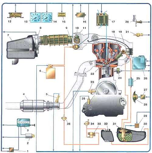 1. реле зажигания; 2. выключатель зажигания; 3. аккумуляторная батарея; 4. нейтрализатор; 5. датчик концентрации кислорода; 6. адсорбер с электромагнитным клапаном; 7. воздушный фильтр; 8. датчик массового расхода воздуха; 9. регулятор холостого хода; 10. датчик положения дроссельной заслонки; 11. дроссельный узел; 12. колодка диагностики; 13. тахометр; 14. спидометр; 15. контрольная лампа "CHECK ENGINE"; 16. блок управления иммобилайзером; 17. модуль зажигания; 18. форсунка; 19. регулятор давления топлива; 20. датчик фаз; 21. датчик температуры охлаждающей жидкости; 22. свеча зажигания; 23. датчик положения коленчатого вала; 24. датчик детонации; 25. топливный фильтр; 26. контроллер; 27. реле включения вентилятора; 28. электровентилятор системы охлаждения; 29. реле включения электробензонасоса; 30. топливный бак; 31. электробензонасос с датчиком указателя уровня топлива; 32. сепаратор паров бензина; 33. гравитационный клапан; 34. предохранительный клапан; 35. датчик скорости; 36. двухходовой клапан.