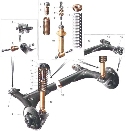 Основной несущий элемент подвески - балка, состоящая из продольных рычагов 14 и соединителя 13, сваренных между собой через усилители. Сзади к рычагам подвески приварены кронштейны 15 с проушинами для крепления амортизаторов 10 и фланцы для крепления осей задних колес и щитов тормозных механизмов. Спереди рычаги 14 снабжены приварными втулками с запрессованными в них сайлент-блоками 3. Через центральную втулку сайлент-блока проходит болт, соединяющий рычаг с кронштейном 2. Для крепления кронштейна к лонжерону кузова предусмотрены три приварных болта.