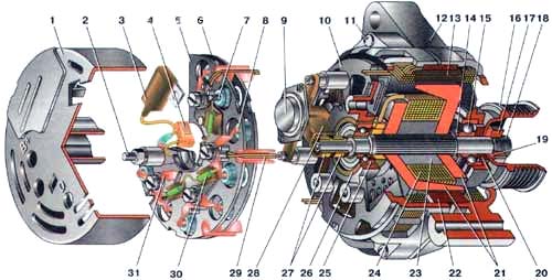 1. кожух; 2. вывод "В+" для подключения потребителей; 3. помехоподавительный конденсатор 2,2 мкФ; 4. общий вывод дополнительных диодов (присоединяется к выводу "D+" регулятора напряжения); 5. держатель положительных диодов выпрямительного блока; 6. держатель отрицательных диодов выпрямительного блока; 7. положительный диод; 8. отрицательный диод; 9. регулятор напряжения; 10. задняя крышка; 11. стяжной винт; 12. передняя крышка; 13. обмотка статора; 14. дистанционное кольцо; 15. передний подшипник вала ротора; 16. шкив; 17. гайка; 18. вал ротора; 19. конусная шайба; 20. шайба; 21. клювообразные полюсные наконечники ротора; 22. сердечник статора; 23. втулка; 24. обмотка ротора; 25. задний подшипник ротора; 26. втулка подшипника; 27. контактные кольца; 28. щеткодержатель; 29. выводы обмотки статора; 30. дополнительный диод; 31. вывод "D" (общий вывод дополнительных диодов).
