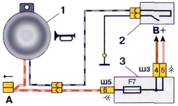 1. звуковой сигнал; 2. выключатель звукового сигнала; 3. монтажный блок; А. колодка проводов к электродвигателю вентилятора системы охлаждения двигателя; В. к источникам питания. |