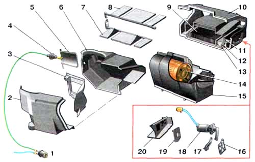 1. воздуховоды обогрева задней части салона; 2. облицовка тоннеля пола; 3. воздуховоды обогрева ног; 4. центральные сопла вентиляции салона; 5. боковые сопла вентиляции салона; 6. сопла обогрева стекол передних дверей; 7. рычаг управления системой отопления салона; 8. корпус воздухораспределителя; 9. заслонка обогрева ног; 10. заслонка обогрева ветрового стекла; 11. отопитель. 1. электропневматический клапан; 2. передний корпус воздухозаборника отопителя; 3. водоотражательный щиток воздухозаборника; 4. клапан управления заслонкой рециркуляции; 5. заслонка рециркуляции воздухозаборника; 6. задний корпус воздухозаборника отопителя; 7. заслонка канала отопителя; 8. заслонка управления отопителем; 9. радиатор; 10. кожух радиатора отопителя; 11. штуцер пароотводящего шланга; 12. штуцер подводящего шланга; 13. штуцер отводящего шланга; 14. электродвигатель отопителя с вентилятором; 15. корпус электродвигателя; 16. опорная площадка рычага привода заслонки управления отопителем; 17. рычаг привода заслонки управления отопителем; 18. микромоторедуктор привода заслонки; 19. резистор; 20. крышка кожуха отопителя. |