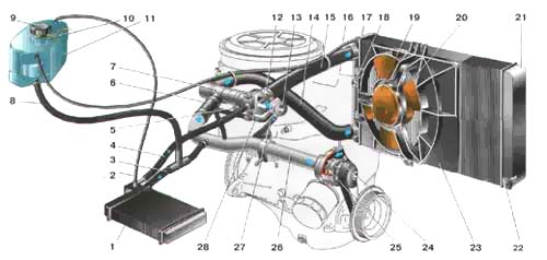 Система охлаждения - жидкостная, закрытого типа, с принудительной циркуляцией. Герметичность системы обеспечивается впускным и выпускным клапанами в пробке расширительного бачка. Выпускной клапан поддерживает повышенное (по сравнению с атмосферным) давление в системе на горячем двигателе (за счет этого температура кипения жидкости становится выше, уменьшаются паровые потери). Он открывается при давлении 1,1-1,5 кгс/см2. Впускной клапан открывается при понижении давления в системе относительно атмосферного на 0,03-0,13 кгс/см2 (на остывающем двигателе).