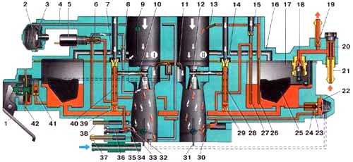 Ускорительный насос - диафрагменного типа, с механическим приводом через профильный кулачок, расположенный на оси дроссельной заслонки первой камеры. При открытии дроссельной заслонки кулачок воздействует на рычаг, который, в свою очередь, надавливает на диафрагму. Порция топлива через распылители впрыскивается в смесительные камеры карбюратора, обогащая горючую смесь на режимах разгона автомобиля. Ускорительный насос снабжен двумя шариковыми клапанами: обратный клапан расположен в канале, связывающем поплавковую камеру с полостью насоса; он открывается и полость заполняется топливом при отпущенной педали "газа", когда возвратная пружина отводит диафрагму насоса назад, и закрывается при нагнетании топлива. Другой клапан расположен в распылителе; он открывается под давлением нагнетаемого топлива и закрывается под действием собственного веса, как только подача топлива прекращается. Это предотвращает вытекание топлива из каналов и подсос воздуха. Производительность насоса не регулируется -она определяется профилем кулачка.