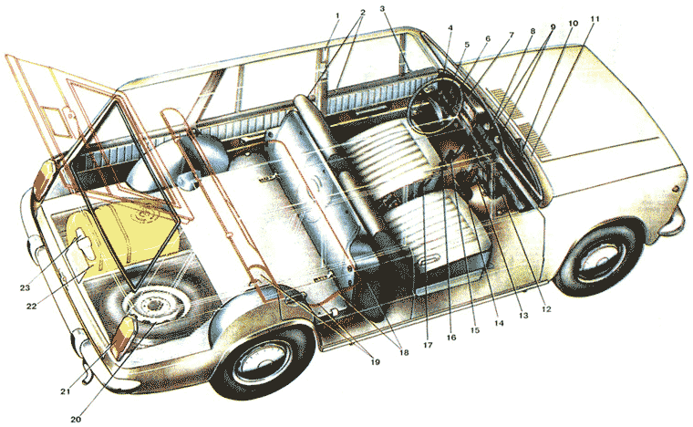 В альбоме описана и наглядно показана конструкция легкового автомобиля ВАЗ-2102 и его модификаций, выпускавшихся Акционерным обществом "АВТОБАЗ" с 1970 по 1988 г. Модификации отличаются от базовых моделей, в основном, установкой двигателей с другим рабочим объемом цилиндров. Компоновка (расположение узлов и агрегатов) автомобилей выполнена по так называемой классической схеме, т.е. двигатель расположен спереди, а ведущими являются задние колеса. Двигатель максимально продвинут вперед, что обеспечивает оптимальное распределение массы по осям, а следовательно, хорошую устойчивость автомобиля на дороге. Салон расположен внутри базы, т.е. в зоне наилучшей плавности хода, что повышает комфортабельность автомобиля при эксплуатации на дорогах с плохим покрытием. В конструкции автомобилей учтены требования активной и пассивной безопасности, которым на Волжском автозаводе всегда уделялось большое внимание. Автомобили отвечают всем требованиям по безопасности Европейской Экономической комиссии ООН. Автомобили имеют хорошую комфортабельность, определяемую легкостью и удобством управления, формой, размерами, расположением и мягкостью сидений, обеспечивающих удобную посадку водителя, эффективной вентиляцией кузова, хорошей обзорностью с места водителя, малой шумностью в салоне, минимальным влиянием колебаний и вибраций кузова. Высокая динамика автомобилей способствует повышению средних скоростей движения и облегчает маневрирование. ВАЗ-2102 имеет кузов типа "универсал" с четырьмя боковыми дверьми и одной задней. Этот автомобиль обладает такими же достоинствами автомобилей с кузовом "седан", как комфортабельность, скорость, экономичность, и в то же время приспособлен для перевозки достаточно крупных грузов, не помещающихся в обычном легковом автомобиле. Дверь задка одностворчатого типа с верхним расположением петель и с неподвижным стеклом служит для доступа в багажное отделение. В открытом поднятом положении дверь удерживается специальным торсионом. При забывании дверь удерживается замком, расположенным в нижней части двери. (лючок замка входит в зацепление с фиксатором, расположенным в нижней части дверного проема. Для исключения колебаний двери при движении автомобиля на замке имеется направляющий шип, который входит в гнездо фиксатора двери. Открывается дверь нажатием на кнопку замка, встроенную в наружную ручку. Запирание двери снаружи осуществляется через замочную скважину кнопки тем же самым ключом, что и запирание передних боковых дверей. Задние боковые двери имеют рамку и стекла измененной формы, а в боковине за задней дверью расположено неподвижное стекло. Для удобства размещения перевозимых вещей запасное колесо 20 инструмент, принадлежности и топливный бак 22 располагаются под полом багажного отделения. Ниша запасного колеса закрывается крышкой, закрепляемой винтом с барашком. Площадь пола и объем багажного отделения могут быть дополнительно увеличены изменением положения подушки и спинки заднего сиденья. При необходимости, подушка заднего сиденья устанавливается вертикально вращением на петлях до упора в спинки передних сидений. Металлический поддон подушки при этом ограничивает багажное отделение и удерживает груз от перемещения вперед. Спинка 19 заднего сиденья, повернутая относительно петель