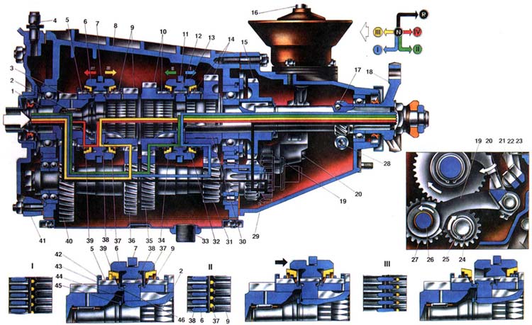 Принцип работы шестеренчатой коробки передач основан на изменении зацепления тех пар шестерен, которые участвуют в передаче крутящего момента от первичного вала 1 на вторичный вал 2. Это достигается перемещением скользящих муфт 6 и 13 синхронизаторов или промежуточной шестерни 27 заднего хода при помощи рычага переключения передач. При этом изменяются передаточные числа шестерен, а значит и величина передаваемого крутящего момента. На прямой четвертой передаче крутящий момент, передаваемый на ведущие колеса автомобиля, практически равен крутящему моменту на коленчатом валу двигателя. На первой передаче момент увеличивается в 3,75 раза, на второй в 2,30 раза, на третьей в 1,49 раза, а при включении задней передачи в 3,87 раза. При нейтральном положении рычага переключения передач крутящий момент на вторичный вал не передается. Но так как двигатель работает и сцепление включено, то вращение от первичного вала 1 передается на промежуточный вал через шестерни 3 и 40 постоянного зацепления. От шестерен 31, 35 и 36 промежуточного вала вращение передается на шестерни 14, 10 и 9 вторичного вала. Так как эти шестерни с валом 2 непосредственно не связаны, то они будут свободно вращаться на вторичном валу. Соединение этих шестерен с валом 2 осуществляется через синхронизаторы. При включении первой передачи усилие от рычага переключения передач через шток и вилку И передается на скользящую муфту 13. Перемещаясь по шлицам своей ступицы 12, муфта входит в зацепление с прямозубым венцом шестерни 14. Таким образом, муфта синхронизатора соединит между собой ступицу 12 и шестерню 14. А так как ступица 12 жестко связана с валом 2, то крутящий момент от шестерни 14 через муфту 13 передается на ступицу 12 и от нее на вторичный вал коробки передач. При включении второй передачи муфта 13 соединим ступицу 12 с прямозубым венцом шестерни 10, и крутящий момент передается от шестерни 10 на ступиц 12 и на вторичный вал. Третья и четвертая передачи включаются другим синхронизатором. При включении третьей передачи крутящий момент от первичного вала через шестерни 36 и 9 передается через муфту 6 на ступицу 38 и затем на вторичный вал. Четвертая передача называется прямой, так как крутящий момент передается непосредственно с первичного вала 1 на вторичный вал 2, минуя шестерни промежуточного вала. В этом случае муфта 6 соединяет между собой зубчатый венец 5 первичного вала со ступицей 38. Частота вращения обоих валов будет одинаковой, а величина крутящего момента, передаваемого от двигателя на ведущие колеса, не изменится. При включении задней передачи усилие от рычага переключения передач через шток 20 и вилку 19 передается на промежуточную шестерню 27. Перемещаясь на оси 26, она соединит между собой шестерни 25 и 15 заднего хода, и крутящий момент передается от первичного вала через шестерни 5 и 40 на промежуточный вал и далее через шестерни 25, 27 и 15 на вторичный вал. При этом последний будет вращаться в обратном направлении, обеспечивая обратное вращение ведущих колес автомобиля. Как видно из схемы работы коробки передач, все передачи переднего хода синхронизированы. Принцип действия синхронизатора при включении третьей передачи показан на схемах 1, 11, III. При нейтральном положении рычага переключения передач (см. схему 1) между скользящей муфтой 6 и блокирующими кольцами 37 имеется зазор. Блокир