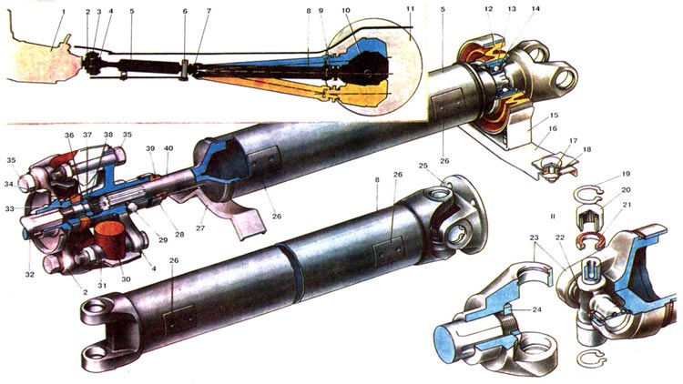1. Коробка передач; 2. Передний фланец эластичной муфты; 3. Эластичная муфта; 4. Задний фланец эластичной муфты; 5. Передний карданный вал: 6. Опора карданного вала; 7. Передний карданный шарнир; 8. Задний карданный вал; 9. Задний карданный шарнир; 10. Задний мост; 11. Ведущее колесо автомобиля; 12. Подушка опоры; 13. Корпус подшипника опоры; 14. Подшипник карданного вала; 15. Кронштейн опоры; 16. Поперечина промежуточной опоры: 17. Дистанционная втулка; 18. Резиновая втулка; 19. Стопорное кольцо игольчатого подшипника; 20. Игольчатый подшипник; 21. Сальник игольчатого подшипника; 22. Крестовина карданного шарнира; 23. Вилка карданного шарнира; 24. Гайка крепления вилки карданного шарнира; 25. Фланец-вилка карданного шарнира; 26. Балансировочная пластина; 27. Кронштейн безопасности переднего карданного вала; 28. Обойма сальника; 29. Пробка отверстия для смазки шлицев; 30. Упругий элемент эластичной муфты; 31. Металлический вкладыш эластичной муфты; 32. Вторичный вал коробки передач; 33. Гайка; 34. Уплотнитель центрирующего кольца; 35. Болты крепления эластичной муфты; 36. Центрирующее кольцо; 37. Центрирующая втулка; 38. Стопорное кольцо; 39. Сальник; 40. Шлицевой хвостовик переднего карданного вала; 41. Схема карданной передачи; 42. Карданный шарнир.