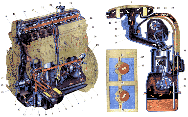 1. Канал подачи масла к коренному подшипнику коленчатого вала; 2. Канал подачи масла от коренного подшипника к шатунному; 3. Масляный картер; 4. Коленчатый вал; 5. Указатель уровня масла; 6. Масляный фильтр; 7. Перепускной клапан; 8. Фильтрующий элемент; 9. Противодренажный клапан; 10. Масляный насос; 11. Канал подачи масла от насоса к фильтру; 12. Горизонтальный канал подачи масла в масляную магистраль; 13. Канал в блоке цилиндров для подачи масла; 14. Передний сальник коленчатого вала; 15. Канал в шейке коленчатого вала; 16. Канал подачи масла от масляной магистрали к коренному подшипник; 17. Валик привода масляного насоса и распределителя зажигания; 18. Отверстие в звездочке для смазки цепи; 19. Звездочка распределительного вала; 20. . Магистральный канал в распределительном валу; 21. Кольцевая выточка на средней опорной шейке распределительного вала; 22. Канал в кулачке распределительного вала; 23. Крышка маслоналивной горловины; 24. Канал в опорной шейке распределительного вала; 25. Корпус подшипников распределительного вала; 26. Наклонный канал в головке цилиндров для подачи масла к газораспределительному механизму; 27. Вертикальный канал в блоке цилиндров для подачи масла к газораспределительному механизму; 28. Магистральный канал в блоке цилиндров; 29. Датчик контрольной лампы и указателя давления масла; 30. Вытяжной коллектор вентиляции картера; 31. Пламегаситель; 32. Вытяжной шланг; 33. Крышка маслоотделителя; 34. Маслоотделитель; 35. Сливная трубка маслоотделителя; 36. Золотник на оси дроссельной заслонки первичной камеры карбюратора; 37. Калиброванное отверстие; 38. Впускная труба; 39. Дроссельная заслонка; 40. Карбюратор; 41. Шланг отсоса картерных газов в задроссельное пространство карбюратора; 42. Воздушный фильтр; 43. I.Схема вентиляции картера; 44. II.Работа золотникового устройства карбюратора; 45. III.При малой частоте вращения коленчатого вала двигателя; 46. IV.При средней частоте вращения коленчатого вала двигателя.