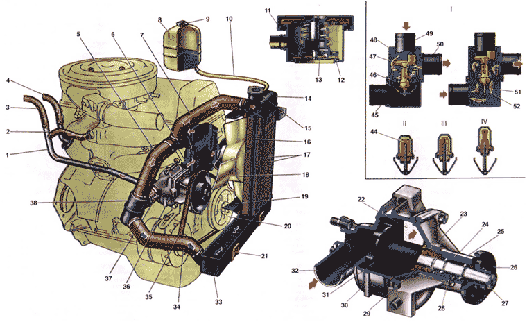 1. Трубка отвода жидкости от радиатора отопителя в насос охлаждающей жидкости; 2. Шланг отвода охлаждающей жидкости от впускной трубы; 3. Шланг отвода охлаждающей жидкости из радиатора отопителя; 4. Шланг подвода жидкости в радиатор отопителя; 5. Перепускной шланг термостата, 6. Выпускной патрубок рубашки охлаждения; 7. Подводящий шланг радиатора. 8. Расширительный бачок; 9. Пробка бачка; 10. Шланг от радиатора к расширительному бачку; 11. Пробка радиатора; 12. Выпускной (паровой) клапан пробки; 13. Впускной клапан; 14. Верхний бачок радиатора; 15. Заливная горловина радиатора; 16. Трубка радиатора; 17. Охлаждающие пластины радиатора; 18. Кожух вентилятора; 19. Вентилятор; 20. Шкив привода насоса охлаждающей жидкости; 21. Резиновая опора; 22. Окно со стороны блока цилиндров для подачи охлаждающей жидкости; 23. Обойма сальника; 24. Подшипник валика насоса охлаждающей жидкости; 25. Крышка насоса; 26. Ступица шкива вентилятора; 27. Валик насоса; 28. Стопорный винт; 29. Манжета сальника; 30. Корпус насоса; 31. Крыльчатка насоса; 32. Приемный патрубок насоса; 33. Нижний бачок радиатора; 34. Отводящий шланг радиатора; 35. Ремень вентилятора; 36. Насос охлаждающей жидкости; 37. Шланг подачи охлаждающей жидкости в насос; 38. Термостат; 39. Резиновая вставка; 40. Входной патрубок; 41. Основной клапан; 42. Перепускной клапан; 43. Корпус термостата; 44. Патрубок перепускного шланга; 45. Патрубок шланга для подачи охлаждающей жидкости в насос; 46. Крышка термостата; 47. Поршень рабочего элемента;