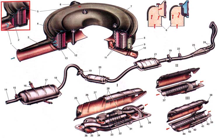1. Воздухозаборник холодного воздуха; 2. Перегородка, закрывающая доступ воздуха в фильтр; 3. Стрелка для установки крышки фильтра по меткам на зимний и летний режимы эксплуатации; 4. Метка голубая для установки на летний режим эксплуатации; 5. Метка красная для установки на зимний режим эксплуатации; 6. Патрубок забора теплого воздуха от выпускного коллектора; 7. Крышка фильтра; 8. Корпус фильтра; 9. Патрубок отсоса картерных газов в золотниковое устройство карбюратора; 10. Коллектор вытяжной вентиляции картера двигателя; 11. Перфорированные оболочки фильтрующего элемента; 12. Картонный фильтрующий элемент; 13. Предочиститель фильтрующего элемента; 14. Выпускная труба; 15. Подушка подвески выпускной трубы; 16. Ремень подвески глушителя; 17. Основной глушитель; 18. Передняя труба основного глушителя; 19. Хомуты; 20. Задний дополнительный глушитель; 21. Передний дополнительный глушитель; 22. Хомут крепления приемной трубы к коробке передач; 23. Газоприемник; 24. Приемная труба; 25. Верхний полукорпус основного глушителя; 26. Теплоизоляция основного глушителя; 27. Кожух основного глушителя; 28. Средние перегородки; 29. Впускной патрубок; 30. Передняя перегородка; 31. Перфорация выпускной трубы; 32. Внутренняя перфорированная труба; 33. Кожух впускной перфорированной трубы; 34. Задняя перегородка; 35. Нижний полукорпус основного глушителя; 36. Выпускной патрубок; 37. Перфорированная труба переднего дополнительного глушителя; 38. Верхний полукорпус заднего дополнительного глушителя; 39. Нижний полукорпус заднего дополнительного глушителя; 40. Передняя перфорированная труба; 41. Глухая перегородка: 42. Кожух заднего дополнительного глушителя; 43. Теплоизоляция заднего дополнительного глушителя; 44. Задняя перфорированная труба; 45. Основной глушитель. 46. Передний дополнительный глушитель; 47. Задний дополнительный глушитель.