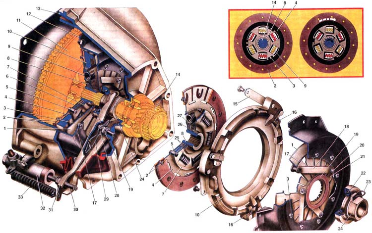 1. Нажимная пружина; 2. Фрикционные накладки ведомого диска; 3. Заклепка нажимной пружины; 4. Ведомый диск; 5. Заклепка-упор гасителя крутильных колебаний; 6. Передняя пластина демпфера; 7. Задняя пластина демпфера; 8. Ступица ведомого диска; 9. Пружина демпфера; 10. Нажимной диск; 11. Маховик: 12. Кожух сцепления; 13. Картер сцепления 14. Первичный вал коробки передач; 15. Пластина соединяющая нажимной диск с кожухом сцепления; 16. Фиксатор нажимной пружины; 17. Кольцо нажимной пружины; 18. Соединительная пластина упорного фланца и кожуха сцепления; 19. Фрикционное кольцо упорного фланца; 20. Заклепка соединительной пластины; 21. Упорный фланец нажимной пружины; 22. Подшипник выключения сцепления; 23. Соединительная пружина вилки и муфты подшипника; 24. Муфта подшипника выключения сцепления; 25. Фрикционные кольца демпфера; 26. Опорное кольцо пружинной шайбы; 27. Пружинная шайба демпфера; 28. Шаровая опора вилки выключения сцепления; 29. Пружина вилки выключения сцепления; 30. Толкатель вилки выключения сцепления; 31. Вилка выключения сцепления; 32. Рабочий цилиндр выключения сцепления; 33. Оттяжная пружина вилки выключения сцепления.