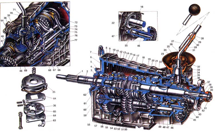 На автомобилях ВАЗ-21065, а по заказу и на ряде автомобилей ВАЗ-2106. устанавливается пятиступенчатая коробка передач. Она создана на базе четырехступенчатой коробки и отличается по внешнему виду формой задней крышки, в полости которой на конце ведомого вала размещена пятая ступень. Введение дополнительной пятой передачи расширило диапазон скоростей движения автомобиля, за счет чего достигается работа двигателя на наиболее экономичных режимах, а также улучшаются условия работы двигателя. Это, в свою очередь, увеличивает долговечность его работы. Передаточные числа одноименных передач у пятии четырехступенчатой коробок одинаковые. Передаточное число пятой передачи - 0.82. В связи с тем, что пятиступенчатая коробка передач сконструирована на базе четырехступенчатой коробки, многие ее детали имеют одинаковое устройство и взаимозаменяемы. Коробка передач так же трехвальная, то есть состоит из первичного 1, вторичного 18 и промежуточного 55 валов. Первичный вал идентичен с валом четырехступенчатой коробки. Вторичный вал отличается своей задней частью, на которой расположены детали пятой ступени. Промежуточный вал отличается тем, что в заднем торце имеет резьбовое отверстие для болта крепления блока 46 шестерен пятой передачи и заднего хода. Ведомые шестерни 16, 17, 19 третьей, второй и первой передач, детали синхронизаторов, подшипники валов унифицированы с одноименными деталями четырехступенчатой коробки передач. Таким образом, конструкция деталей, расположенных в полости картера коробки, одинакова с четырехступенчатой коробкой (см. рис. 15). Детали пятой передачи и заднего хода расположены в полости задней крышки. Вместе с ведомой шестерней 12 (см. рис. 18) заднего хода на ведомом валу 2 одной шпонкой крепится ступица 13 муфты 14 синхронизатора пятой передачи. За ступицей 13 расположена упорная шайба и втулка 18, на которой вращается шестерня 17 пятой передачи. Между втулкой шестерни 17 и ведущей шестерней 20 привода спидометра зажата маслоотражательная шайба 19. Она уменьшает выброс масла в сторону сальника 42 , улучшая условия его работы. Задний конец вторичного вала вращается на роликовом цилиндрическом подшипнике 43, т.к. нагрузка на задний конец вала увеличилась. На шлицах вала крепится фланец 37 эластичной муфты. Все детали, расположенные на вторичном валу, поджимаются гайкой 38, которая фиксируется стопорной шайбой. На цилиндрическом пояске гайки расположен резиновый уплотнитель 39, а на конце вала центрирующее кольцо 40 и ее стопорное кольцо. На шлицах промежуточного вала 55 крепится стяжным болтом блок46 шестерен пятой передачи и заднего хода. Задней опорой для блока шестерен является роликовый цилиндрический подшипник 45. Блок шестерен имеет два венца. Большой венец находится в постоянном зацеплении с ведомой шестерней пятой передачи. С малым венцом входит в зацепление промежуточная шестерня 48 при включении задней передачи. Промежуточная шестерня 48 расположена на оси 47, которая крепится в перегородке картера коробки гайкой с тарельчатой пружинной шайбой. Другой конец оси опирается в гнездо задней крышки. Привод переключения передач также незначительно отличается от привода четырехступенчатой коробки. Изменена конструкция штока 76 и вилки 69 включения задней и пятой передач. На штоке 76 крепится стопорным болтом двойная вилка 69 одн