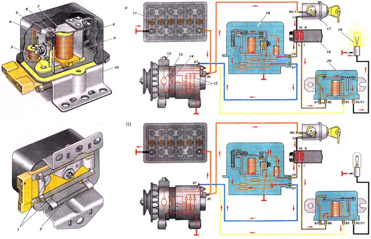 Регулятор напряжения. Для поддержания напряжения в бортовой сети автомобиля на постоянном уровне 13- 14 В, независимо от оборотов ротора, применяется вибрационный двухступенчатый регулятор напряжения типа РР-380. На части автомобилей устанавливается без- контактный электронный регулятор напряжения типа 121.3702. Он может применяться вместо регулятора РР-ЗВО без каких-либо переделок в схеме электрооборудования автомобиля. Регулятор напряжения РР-380 представляет собой электромагнитное реле. Как у каждого реле такого типа, у него есть магнитная система, состоящая из цилиндрического сердечника и U-образного ярма 9, катушка с обмоткой 6 на пластмассовом каркасе, якорь 7 с подвижным контактом и две стойки 4 и 5 с неподвижными контактами. Пазы в стойках позволяют передвигать их вверх и вниз при регулировке регулятора. Верхний и нижний контакты якоря в сочетании с контактами стоек образуют две пары контактов - верхнюю и нижнюю. Пружиной якорь прижат к контакту верхней стойки. Подгибая нижний кронштейн пружины, можно изменять ее натяжение и этим регулировать величину напряжения, при котором будет размыкаться верхняя пара контактов. Под основанием на изоляционной прокладке находятся термокомпенсирующий 1 и два дополнительных резистора 2 с общим сопротивлением 5,5 Ом. Дроссель 3 служит для уменьшения искрения между верхней парой контактов. Реле контрольной лампы заряда аккумуляторной батареи. Реле 20 типа РС702 предназначено для включения контрольной лампы в комбинации приборов, когда напряжение генератора недостаточно для заряда аккумуляторной батареи. Напряжение размыкания контактов реле при (25+5) "С составляет (5,3+0,4) В, а замыкания 0,0-1,5 В. Сопротивление обмотки равно 29 Ом. Работа системы генератора. В работе системы генератора можно выделить три режима: работа при малой, средней и высокой частоте вращения ротора генератора. 1 Режим. Это режим пуска двигателя, когда он еще не работает или прокручивается стартером. В этом случае потребители питаются от аккумуляторной батареи. На этом режиме после включения зажигания в цепи обмотки возбуждения генератора протекает ток, замыкающийся по пути: "плюс" аккумуляторной батареи - выключателя зажигания 17 - предохранитель "10" штекер "15", сердечник дросселя 3, замкнутые верхние контакты. якорь. ярмо. штекер "67" регулятора штекер "67" генератора - обмотка возбуждения генератора - "масса" - "минус" аккумуляторной батареи. Этот ток создает магнитный поток, который при вращении ротора генератора пересекает витки обмотки статора генератора и наводит в них электродвижущую силу. Одновременно протекает ток через обмотку 6 регулятора напряжения, который создает магнитное притяжение якоря регулятора к сердечнику, но еще не настолько сильное, чтобы притянуть якорь к сердечнику и разомкнуть верхнюю пару контактов регулятора напряжения. Одновременно горит контрольная лампа 19, сигнализируя о том, что все потребители питаются от аккумуляторной батареи. Ток через лампу идет по пути: "+" аккумуляторной батареи выключатель зажигания предохранитель "9" - замкнутые контакты реле 20 контрольная лампа 19 - "масса" - " аккумуляторной батареи. И режим. После пуска двигателя выпрямленное напряжение генератора превышает напряжение аккумуляторной батареи. Обмотка возбуждения генератора и обмотка регулятора напряжения питаются от г