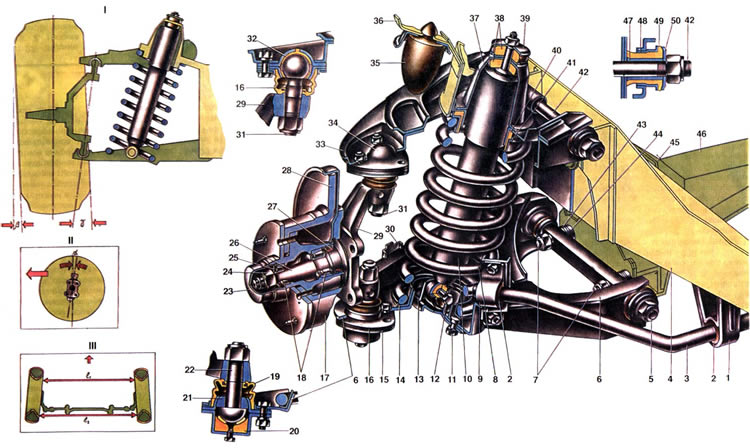 Связывающим звеном между колесами и кузовом являются передняя и задняя подвески автомобиля. Через них передаются на кузов силы, действующие на колеса. Элементы, входящие в подвески, смягчают нагрузки, уменьшают колебания кузова, обеспечивают хорошую устойчивость и плавность хода автомобиля. К этим элементам относятся направляющее устройство, упругие элементы, амортизаторы и стабилизатор поперечной устойчивости. Направляющее устройство подвески определяет характер движения колеса относительно дороги и кузова и передает силы и моменты от колеса к кузову. К этому устройству относятся верхний 33 и нижний 6 рычаги подвески и шарнирно связанный с ними поворотный кулак 29. Верхний рычаг соединен осью 42 со стойкой передка кузова при помощи резинометаллических шарниров. Ось, выполненная в виде болта с шестигранной головкой, проходит через проушины рычага 33 и через втулку стойки передка кузова. В проушины верхнего рычага запрессованы резинометаллические шарниры, каждый из которых состоит из резиновой втулки 49, запрессованной между внутренней 47 и наружной 48 металлическими втулками с большим натягом. Наружная вгулка 48 запрессована в проушину верхнего рычага, а внутренняя 47 насажена на ось 42. Шарнир зажат на оси гайкой между полкой верхнего рычага и упорной шайбой 50. Качание верхнего рычага происходит в пределах деформации резиновой втулки 49. Резиновая втулка не должна проскальзывать относительно металлических втулок или шарнира на оси и в рычаге. Такая конструкция шарнира обеспечивает плотное соединение оси с рычагом подвески. К верхнему рычагу подвески тремя болтами крепится шаровая опора 34 неразъемной конструкции. В корпусе опоры расположен подшипник 32, основа которого - смола, а поверхность трения - тефлоновая ткань, плотно облегающая сферическую поверхность пальца 31. Детали шаровой опоры защищены от загрязнения резиновым армированным чехлом 19. Палец 31 установлен в коническое отверстие поворотного кулака 29 и закреплен самоконтрящейся гайкой. Нижний рычаг 6 подвешен на оси 5, которая двумя болтами 7 крепится к поперечине 46 подвески. Последняя крепится к лонжеронам кузова. Между осью и поперечиной установлены дистанционная 44 и регулировочные 43 шайбы. Изменением количества шайб 43 регулируют продольный угол (наклона оси поворота и угол развала) передних колес.' Резинометаллические шарниры нижнего рычага такой же конструкции, как и верхнего, отличаются только размерами и формой втулок. Снизу к рычагу подвески тремя болтами крепится нижняя шаровая опора. Ее конструкция отличается от верхней опоры. В корпусе опоры расположен палец 22 с полусферической головкой. На стержень пальца надет подшипник 21 с полусферической поверхностью. В нижнюю часть корпуса вставлен с натягом вкладыш 20, изготовленный из маслостойкой резины. На его поверхности, контактирующей с полусферой пальца 22, привулканизирован пластмассовый слой (смесь нейлона с сульфидом молибдена). За счет резинового вкладыша выбираются зазоры между деталями шаровой опоры, а подшипник 21 поджимается к полусферической поверхности верхней части корпуса опоры. Снизу в корпусе опоры имеется отверстие, через которое смазывается шарнир. Оно закрывается конической пробкой. Детали шаровой опоры защищены от загрязнения защитным чехлом 19. Нижняя шаровая опора соединена с пов