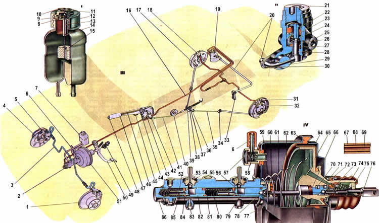 Тормозная система автомобиля по своему назначению и выполняемым функциям разделяется на рабочую, запасную и стояночную. Рабочая тормозная система обеспечивает регулирование скорости автомобиля и его остановку с необходимой эффективностью, запасная остановку автомобиля с необходимой эффективностью при выходе из строя рабочей тормозной системы, а стояночная служит для удержания стоящего автомобиля. Ее можно использовать и как аварийную при выходе из строя рабочей или запасной тормозных систем. Рабочая тормозная система имеет двухконтурный раздельный гидравлический привод на тормозные механизмы передних и задних колес, что значительно повышает безопасность движения автомобиля. При отказе одного из контуров другой используется в качестве запасной тормозной системы, т. е. она является частью рабочей тормозной системы. Привод тормозов Гидравлический привод включает в себя тормозную педаль 50, вакуумный усилитель 51, главный цилиндр 2 гидропривода тормозов, бачок 7, регулятор 19 давления задних тормозов, колесные (рабочие) цилиндры тормозных механизмов, трубопроводы и шланги. Педаль 15 тормоза подвешена к кронштейну 4 совместно с педалью сцепления при помощи оси 8. В ступице педали установлены разрезные пластмассовые втулки 9, через которые проходит внутренняя металлическая втулка 5. Относительно этой втулки поворачивается педаль тормоза. Педаль шарнирно соединена с толкателем вакуумного усилителя и в исходное положение возвращается усилием оттяжной пружины. В этом положении упор педали упирается в буфер выключателя 49 стоп-сигнала. Вакуумный усилитель уменьшает усилие, прикладываемое к педали тормоза при торможении. Он крепится к пластине кронштейна педалей сцепления и тормоза на четырех шпильках гайками. Между вакуумным усилителем и пластиной кронштейна установлена резиновая изолирующая прокладка. Между корпусом 77 и крышкой 64 корпуса вакуумного усилителя зажат наружный поясок резиновой диафрагмы 63, разделяющий усилитель на вакуумную и атмосферную полости. Вакуумная полость через шланг 6 с наконечником и клапаном 58 соединяется с впускной трубой двигателя. Для герметизации соединения наконечник 6 соединен с вакуумным усилителем через резиновый фланец. Внутри вакуумного усилителя расположен пластмассовый корпус 65 клапана, хвостовик которого на выходе из корпуса вакуумного усилителя герметизирован уплотнителем 72. Он установлен в гнезде корпуса усилителя и поджат к отбортовке гнезда дистанционным кольцом, которое запирается стопорным кольцом. Для защиты подвижного хвостовика корпуса клапана от загрязнения на отбортованную часть корпуса усилителя и на хвостовик корпуса клапана надет гофрированнный защитный чехол 74 В корпусе 65 клапана размещены: буфер 66, поршень 71 с толкателем 76. резиновый клапан 73, пружины с опорными чашками и воздушный фильтр 75. В выточку поршня 71 заходит упорная пластина 70, другой конец которой упирается в поясок диафрагмы 63. что предотвращает ее выпадание. Пластина 70 фиксирует в корпусе 65 поршень в сборе с толкателем 76 и клапаном 73. В буфер 66 упирается в шток 61 привода поршня главного цилиндра. На выходе из корпуса вакуумного усилителя шток обжат уплотнителем 60. который поджимается обоймой 59 к гнезду корпуса усилителя. В торцевое отверстие штока ввернут болт 78, которым регулируется вых
