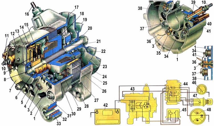 1. Крышка генератора со стороны контактных колец. 2. Выпрямительный блок. 3. Болт крепления выпрямительного блока и фазных выводов обмотки статора. 4. Контактные кольца. 5. Смотри 4. 6. Задний шариковый подшипник вала ротора. 7. Конденсатор для уменьшения уровня радиопомех. 8. Вал ротора. 9. Щетка, соединенная с выводом ''ш" регулятора напряжения. 10. Плюсовой клеммовый болт (вывод "ЗО"). 11. Штекер центрального вывода обмотки статора. 12. Кожух регулятора напряжения и щеткодержателя. 13. Регулятор напряжения. 14. Щеткодержатель. 15. Щетка, соединенная с выводом "В" регулятора напряжения. 16. Шпилька для крепления планки натяжного устройства. 17. Крыльчатка шкива. 18. Передний клювообразный полюсный наконечник ротора. 19. Шкив привода генератора. 20. Гайка крепления шкива. 21. Дистанционное кольцо. 22. Передний шариковый подшипник вала ротора. 23. Крышка генератора со стороны привода . 24. Каркас обмотки ротора. 25. Обмотка ротора. 26. Изоляция паза статора. 27. Статор. 28. Клин проводов статора. 29. Обмотка статора. 30. Задний клювообразный полюсный наконечник ротора. 31. Стяжной болт генератора. 32. Буферная втулка. 33. Втулка. 34. Диод выпрямителя с обратной полярностью ("отрицательный' ) 35. Изолирующая пластина. 36. Фазный вывод обмотки статора. 37. Диод выпрямителя с нормальной полярностью ("положительный’’) 38. Держатель положи тельных диодов. 39. Изоляционные втулки. 40. Провод центрального вывода обмотки статора. 41. Держатель отрицательных диодов 42. Аккумуляторная батарея. 43. Генератор. 44. Монтажный блок . 45. Реле контрольной лампы заряда аккумуляторной батарейке. 46. Вольтметр. 47. Выключатель зажигания. 48. Комбинация приборов с контрольной лампой заряда аккумуляторной батареи.