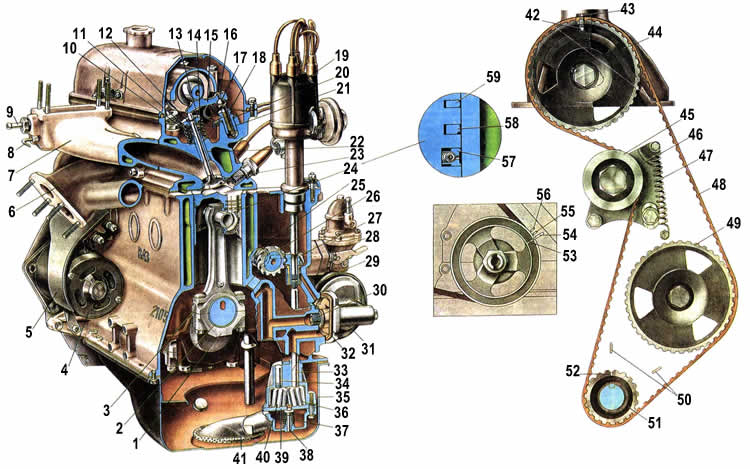 1. Крышка шатуна. 2. Вкладыш шатуна. 3. Шатун. 4. Стартер . 5. Теплоизолирующий щиток стартера. 6. Выпускной коллектор. 7. Впускная труба. 8. Дренажная трубка впускной трубы. 9. Штуцер трубки для отвода охлаждающей жидкости . 10. Наружная пружина клапана. 11. Внутренняя пружина клапана. 12. Сухарь клапана. 13. Тарелка пружин. 14. Маслоотражательный колпачок. 15. Рычаг привода клапана. 16. Пружина рычага привода клапана. 17. Регулировочный болт клапана. 18. Контргайка регулировочного болта. 19. Распределитель зажигания. 20. Стопорная пластина пружины рычага клапана. 21. Втулка регулировочного болта. 22. Направляющая втулка клапана. 23. Седло клапана. 24. Поршень. 25. Эксцентрик для привода топливного насоса. 26. Валик привода масляного насоса и распределителя зажигания. 27. Шестерня привода масляного наcoca и распределителя зажигания. 28. Топливный насос. 29. Масляный фильтр. 30. Штуцер крепления переходника масляного фильтра. 31. Переходник масляного фильтра. 32. Прокладка. 33. Валик масляного насоса. 34. Ось ведомой шетерни масляного насоса. 35. Корпус масляного насоса. 36. Ведущая шестерня масляного насоса. 37. Пружина редукционного клапана. 38. Редукционный клапан масляного насоса. 39. Крышка масляного насоса. 40. Ведомая шестерня масляного насоса. 41. Приемный патрубок масляного насоса. 42. Установочная метка на шкиве распределительного вала. 43. Установочный выступ на корпусе подшипников распределительного вала. 44. Шкив распределительного валы. 45. Натяжной ролик. 46. Кронштейн натяжного ролика. 47. Натяжная пружина. 48. Зубчатый ремень привода распределительного вала. 49. Шкив привода масляного насоса и распределителя зажигания. 50. Установочные метки на крышке распределительного вала. 51. Зубчатый шкив коленчатого вяла. 52. Установочная метка на зубчатом шкиве. 53. Метка в.т.м. на шкиве коленчатого вала. 54. Метка опережения зажигания на 0 . 55. Метка опережения зажигания на 5 . 56. Метка опережения зажигания на 10 . 57. Маслосъемное кольцо. 58. Нижнее компрессионное кольцо. 59. Верхнее компрессионное кольцо.