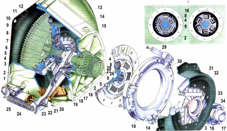 1. Нажимная пружина; 2. Фрикционные накладки ведомого диска; 3. Заклепка нажимной пружины; 4. Ведомый диск: 5. Заклепка-упор демпфера (гасителя крутильных колебаний); 6. Передняя пластина Демпфера; 7. Задняя пластина демпфера; 8. Ступица ведомого диска; 9. Пружина демпфера; 10. Нажимный диск; 11. Маховик; 12. Крышка картера сцепления; 13. Картер сцепления: 14. Кожух сцепления: 15. Передняя крышка коробки передач; 16. Ведущий вал коробки передач; 17. Муфта подшипника выключения сцепления; 18. Фрикционное кольцо упорного фланца: 19. Шаровая опора вилки выключения сцепления: 20. Пружина вилки выключения сцепления; 21. Кольцо нажимной пружины: 22. Толкатель вилки выключения сцепления; 23. Вилка выключения сцепления; 24. Рабочий цилиндр выключения сцепления; 25. Обтяжная пружина вилки выключения сцепления: 26. Фрикционные кольца демпфера: 27. Опорное кольцо пружинной шайбы: 28. Пружинная шайба демпфера: 29. Пластина. соединяющая нажимной диск с кожухом сцепления; 30. Фиксатор нажимной пружины: 31. Соединительная пластина упорного фланца и кожуха сцепления: 32. Упорный фланец нажимной пружины; 33. Подшипник выключения сцепления: 34. Соединительная пружина вилки и муфты выключения сцепления; 35. I.Схема действия демпфера.