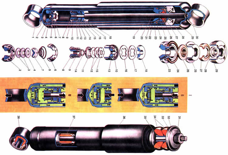 1. Нижняя головка; 2. Корпус клапана сжатия; 3. Диски клапана сжатия; 4. Дроссельный диск клапана сжатия; 5. Пружина клапана сжатия; 6. Обойма клапана сжатия; 7. Тарелка клапана сжатия; 8. Гайка клапана отдачи; 9. Пружина клапана отдачи; 10. Поршень амортизатора; 11. Тарелка клапана отдачи; 12. Диски клапана отдачи; 13. Кольцо поршня; 14. Шайба гайки клапана отдачи; 15. Дроссельный диск клапана отдачи; 16. Тарелка перепускного клапана; 17. Пружина перепускного клапана; 18. Ограничительная тарелка; 19. Резервуар; 20. Шток; 21. Цилиндр; 22. Кожух; 23. Направляющая втулка штока; 24. Уплотнительное кольцо резервуара; 25. Обойма сальника штока; 26. Сальник штока; 27. Прокладка защитного кольца штока; 28. Защитное кольцо штока; 29. Гайка резервуара; 30. Верхняя головка амортизатора; 31. Гайка крепления переднего амортизатора; 32. Пружинная шайба; 33. Шайба подушки; 34. Подушки; 35. Распорная втулка; 36. Кожух амортизатора передней подвески; 37. Буфер штока; 38. Резинометаллический шарнир; 39. Схема работы амортизатора; 40. II.Ход сжатия; 41. Ход отдачи.
