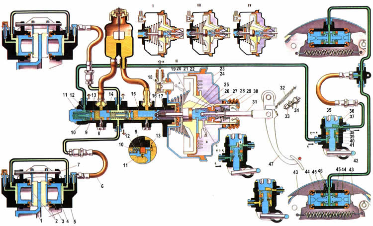 1. Диск тормозного механизма; 2. Тормозная колодка переднего тормоза; 3. Уплотнительное кольцо поршня; 4. Поршень колесного цилиндра; 5. Колесный цилиндр переднего тормоза; 6. Тормозной шланг контура привода передних тормозов; 7. Палец крепления тормозных колодок: 8. Ограничительный винт хода поршня; 9. Уплотнительное кольцо; 10. Упорная чашка; 11. Поршень привода задних тормозов; 12. Пружина уплотнительного кольца; 13. Втулка; 14. Корпус главного цилиндра: 15. Поршень привода передних тормозов: 16. Уплотнитель; 17. Шток; 18. Вакуумный клапан; 19. Возвратная пружина корпуса клапана; 20. Корпус клапана: 21. Диафрагма: 22. Корпус вакуумного клапана; 23. Крышка корпуса вакуумного усилителя; 24. Буфер штока; 25. Упорная пластина поршня; 26. Поршень; 27. Клапан вакуумного усилителя; 28. Пружина клапана; 29. Возвратная пружина клапана; 30. Воздушный фильтр; 31. Толкатель клапана; 32. Оттяжная пружина педали: 33. Наконечник выключателя стоп-сигнала; 34. Выключатель стоп-сигнала; 35. Пробка корпуса регулятора давления; 36. Поршень регулятора давления; 37. Втулка корпуса; 38. Уплотнитель головки поршня: 39. Тарелка пружины; 40. Пружина поршня; 41. Уплотнительное кольцо поршня регулятора давления; 42. Рычаг привода регулятора давления; 43. Колодка заднего тормоза: 44. Стяжная пружина колодок; 45. Поршень колесного цилиндра заднего тормоза; 46. Распорная пружина поршней; 47. Уплотнители поршней колесного цилиндра; 48. Педаль тормоза; 49. А. Вакуумная полость; 50. В. Канал, соединяющий вакуумную полость с внутренней полостью клапана; 51. С. Канал, соединяющий внутреннюю полость клапана с атмосферной полостью; 52. D. Атмосферная полость; 53. К. Шланг. соединяющий вакуумный усилитель с впускной трубой двигателя; 54. I.Педаль не нажата; 55. II.Торможение; 56. III.Нажатие на педаль приостановлено; 57. IV.Растормаживание.