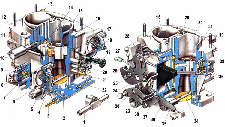 На автомобилях ВАЗ-21065 устанавливается карбюратор модели 21053-1107010. Тарировочные данные карбюратора приведены в таблице. Карбюратор имеет сбалансированную поплавковую камеру, систему отсоса картерных газов за дроссельную заслонку, блокировку второй камеры. В карбюраторе имеются две главные дозирующие системы первой и второй камер, система холостого хода первой камеры с переходной системой, переходная система второй камеры, экономайзер принудительного холостого хода, экономайзер мощностных режимов, диафрагменный ускорительный насос с механическим приводом и диафрагменное пусковое устройство. Карбюратор состоит из двух корпусных деталей: корпуса 8 и крышки 12 карбюратора. Во входной горловине первой камеры установлена воздушная заслонка 15 пускового устройства. На оси воздушной заслонки жестко установлен рычаг 28 с двумя штифтами, на один из которых надета возвратная пружина. Второй штифт входит в фигурный паз рычага 25 управления воздушной заслонкой. На наружную кромку рычага 25 опираются регулировочный винт 24 приоткрывания дроссельной заслонки первой камеры и штифт рычага 20 блокировки второй камеры. В крышке 12 карбюратора установлены игольчатый запорный клапан 33 подачи топлива, поплавок 38, топливный фильтр 32, патрубок 13 подачи топлива в поплавковую камеру. К приливу крышки 12 крепится крышка пускового устройства с диафрагмой 17 в сборе со штоком 26. В крышку завернут электромагнитный запорный клапан 10 с топливным жиклером холостого хода. В корпусе 8 карбюратора отлиты большие диффузоры и установлены малые легкосъемные диффузоры, отлитые заодно с распылителями главных дозирующих систем. В корпусе 8 установлены распылители 16 ускорительного насоса с шариковым клапаном, главные воздушные жиклеры 14 и 29 с эмульсионными трубками 30 в эмульсионных колодцах, заборная трубка переходной системы с топливным жиклером. В эмульсионные колодцы завернуты главные топливные жиклеры 36. В приливы корпуса карбюратора устанавливаются регулировочный винт полноты закрытия дроссельной заслонки 34 второй камеры, а также регулировочный винт 19 количества смеси холостого хода с электроприводом 27 конечного выключателя экономайзера принудительного холостого хода. В корпус завернут регулировочный винт 22 качества смеси холостого хода. К приливу корпуса 8, образующему рабочую полость ускорительного насоса, четырьмя винтами крепится крышка ускорительного насоса с рычагом 4 привода в сборе с диафрагмой 6 насоса. К корпусу крепится также винтами крышка экономайзера мощностных режимов с рабочей диафрагмой 9. На диафрагму воздействует пружина. В корпус карбюратора под диафрагмой 9 установлены топливный жиклер 7 и клапан экономайзера мощностных режимов. В нижней части корпуса 8 установлены на осях дроссельные заслонки 2 и 34. На оси дроссельной заслонки первой камеры установлены: рычаг 23 привода дроссельных заслонок с регулировочным винтом 24 приоткрывания заслонки и с рычагом 20 блокировки второй камеры; рычаг 37 привода дроссельной заслонки второй камеры; возвратная пружина и кулачок 5 ускорительного насоса. На оси дроссельной заслонки второй камеры установлен рычаг 35 дроссельной заслонки. Блокировка второй камеры не допускает открывания дроссельной заслонки второй камеры на любом режиме работы двигателя, если полностью не открыта воздушная 