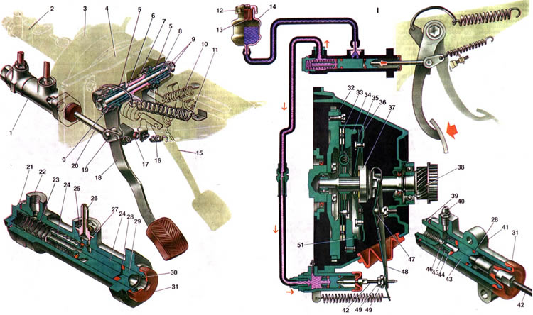 1. Главный цилиндр привода выключения сцепления; 2. Главный цилиндр привода тормозов; 3. Вакуумный усилитель; 4. Кронштейн педалей сцепления и тормоза; 5. Внутренние втулки педалей сцепления и тормоза; 6. Крючок сервопружины; 7. Дистанционная втулка; 8. Ось педалей; 9. Наружные втулки педалей сцепления и тормоза; 10. Оттяжная пружина педали тормоза: 11. Сервопружина: 12. Пробка бачка; 13. Отражатель пробки; 14. Бачок главного цилиндра; 15. Педаль тормоза; 16. Оттяжная пружина педали сцепления; 17. Ограничительный винт хода педали сцепления; 18. Педаль сцепления; 19. Пластина оттяжной пружины педали сцепления; 20. Толкатель: 21. Пробка корпуса главного цилиндра; 22. Корпус главного цилиндра; 23. Пружина поршня; 24. Поршень главного цилиндра; 25. Стопорная шайба: 26. Штуцер; 27. Прокладка штуцера; 28. Уплотнитель: 29. Поршень толкателя: 30. Стопорное кольцо; 31. Защитный колпачок; 32. Маховик; 33. Ведомый диск; 34. Нажимной диск; 35. Нажимная пружина; 36. Кожух сцепления; 37. Подшипник выключения сцепления; 38. Первичный вал коробки передач; 39. Пробка корпуса рабочего цилиндра; 40. Штуцер; 41. Корпус рабочего цилиндра; 42. Толкатель вилки выключения сцепления; 43. Поршень; 44. Опорная тарелка пружины поршня; 45. Пружина; 46. Опорная шайба пружины; 47. Шаровая опора вилки выключения сцепления; 48. Вилка выключения сцепления; 49. Регулировочная гайка; 50. Контргайка; 51. Фиксатор нажимной пружины; 52. Схема действия гидропривода сцепления.