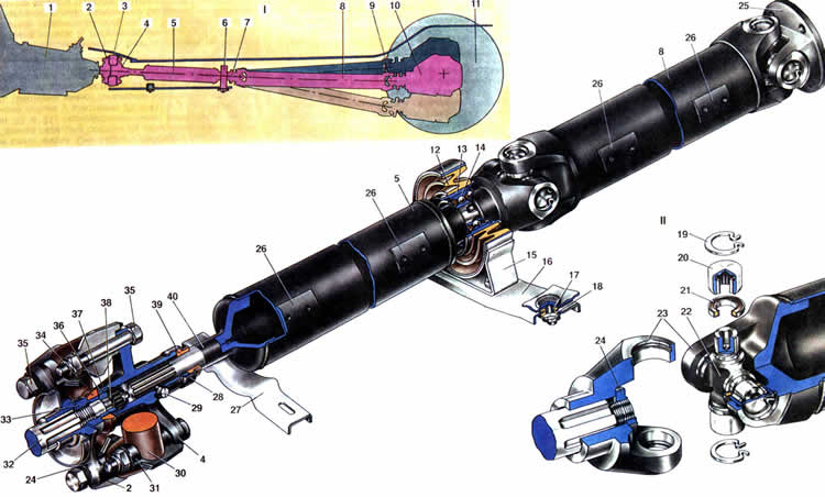 1. Коробка передач; 2. Передний фланец эластичной муфты; 3. Эластичная муфта; 4. Задний фланец эластичной муфты; 5. Передний карданный вал: 6. Опора карданного вала; 7. Передний карданный шарнир; 8. Задний карданный вал; 9. Задний карданный шарнир; 10. Задний мост; 11. Ведущее колесо автомобиля; 12. Подушка опоры; 13. Корпус подшипника опоры; 14. Подшипник карданного вала; 15. Кронштейн опоры; 16. Поперечина промежуточной опоры: 17. Дистанционная втулка; 18. Резиновая втулка; 19. Стопорное кольцо игольчатого подшипника; 20. Игольчатый подшипник; 21. Сальник игольчатого подшипника; 22. Крестовина карданного шарнира; 23. Вилка карданного шарнира; 24. Гайка крепления вилки карданного шарнира; 25. Фланец-вилка карданного шарнира; 26. Балансировочная пластина; 27. Кронштейн безопасности переднего карданного вала; 28. Обойма сальника; 29. Пробка отверстия для смазки шлицев; 30. Упругий элемент эластичной муфты; 31. Металлический вкладыш эластичной муфты; 32. Вторичный вал коробки передач; 33. Гайка; 34. Уплотнитель центрирующего кольца; 35. Болты крепления эластичной муфты; 36. Центрирующее кольцо; 37. Центрирующая втулка; 38. Стопорное кольцо; 39. Сальник; 40. Шлицевой хвостовик переднего карданного вала; 41. Схема карданной передачи; 42. Карданный шарнир.