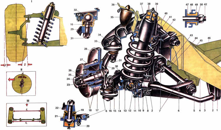 1. Кронштейн крепления штанги стабилизатора к лонжерону кузова; 2. Подушка штанги стабилизатора; 3. Штанга стабилизатора поперечной устойчивости; 4. Лонжерон кузова: 5. Ось нижнего рычага; 6. Нижний рычаг подвески; 7. Болты крепления оси нижнего рычага к поперечине подвески; 8. Пружина подвески; 9. Обойма крепления штанги стабилизатора; 10. Амортизатор: II. 11. Болт крепления кронштейна амортизатора к нижнему рычагу; 12. Болт крепления амортизатора; 13. Кронштейн крепления амортизатора к нижнему рычагу; 14. Нижняя опорная чашка пружины; 15. Обойма вкладыша нижней опоры; 16. Корпус подшипника нижнего шарового пальца; 17. Ступица переднего колеса; 18. Подшипники ступицы переднего колеса; 19. Защитный чехол шарового пальца; 20. Вкладыш обоймы нижнего шарового пальца: 21. Подшипник нижнего шарового пальца; 22. Шаровой палец нижней опоры: 23. Колпак ступицы: 24. Регулировочная гайка; 25. Шайба: 26. Цапфа поворотного кулака; 27. Сальник ступицы: 28. Тормозной диск; 29. Поворотный кулак: 30. Ограничитель доворота передних колес; 31. Шаровой палец верхней опоры; 32. Подшипник верхнего шарового пальца: 33. Верхний рычаг подвески; 34. Корпус подшипника верхнего шарового пальца; 35. Буфер хода сжатия; 36. Кронштейн буфера хода сжатия; 37. Опорный стакан амортизатора; 38. Подушка крепления штока амортизатора; 39. Шайба подушки штока амортизатора: 40. Изолирующая прокладка пружины подвески: 41. Верхняя опорная чашка пружины; 42. Ось верхнего рычага подвески; 43. Регулировочные шайбы; 44. Дистанционная шайба; 45. Кронштейн крепления поперечины к лонжерону кузова; 46. Поперечина передней подвески; 47. Внутренняя втулка шарнира: 48. Наружная втулка шарнира; 49. Резиновая втулка шарнира: 50. Упорная шайба шарнира; 51. Развал (Ь) и угол поперечного наклона оси поворота (g); 52. Продольный угол оси поворота колеса (а); 53. Схождение передних колес (L2-LI).