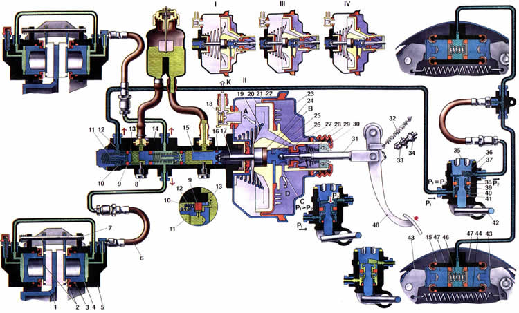 Когда система расторможена и педаль тормоза под действием пружины 32 оттягивается до упора в выключатель 34 стоп-сигнала, то вместе с педалью оттягивается толкатель 31 с поршнем 26 вакуумного усилителя. Корпус 20 клапана и шток 17 отжаты пружиной 19 в крайнее заднее положение. При таком положении между головкой клапана 27 и седлом клапана образуется зазор, так как поршень отжимает клапан от седла. Вакуумная полость А через канал В, зазор между седлом и клапаном и далее через канал С сообщается с атмосферной полостью D. Поэтому при работающем двигателе разрежение из впускной трубы через клапан 18 передается в полость А и через каналы и зазоры в полость D. Поршни 11 и 15 главного цилиндра под действием возвратных пружин отжаты в заднее крайнее положение до упора в стопорные винты 8, отжимают уплотни- тельные кольца 9 от торца канавки поршня и через образовавшиеся зазоры рабочие полости цилиндра сообщаются с бачком гидроцилиндра и трубопроводами высокого давления. Таким образом, в приводе тормозов давление отсутствует. Поэтому поршни 4 под действием упругой деформации уплотнительных колец 3 отводятся внутрь цилиндров и не оказывают давления на тормозные колодки передних тормозов, которые будут находиться в легком соприкосновении с поверхностью тормозного диска. При движении автомобиля без торможения, то есть когда в гидравлическом приводе нет давления, поршень 36 под действием пружины 40 и торсионного рычага 42 поднят вверх до упора в пробку 35. Поэтому полости корпуса, находящиеся над головкой поршня и под ней, свободно сообщаются. Это открывает свободный проход жидкости к колесным цилиндрам задних тормозов. Но так как нет давления во всем приводе, тормозные колодки 43 отжаты от барабанов. При торможении, когда водитель нажимает на тормозную педаль, толкатель 31 перемещает поршень 26. Вслед за поршнем перемещается под действием пружины 28 клапан 27 до упора в седло корпуса клапана. При перекрытии седла полости А и D разобщаются. При дальнейшем перемещении поршня 26 между ним и буртиком клапана 27 образуется зазор, через который полость D сообщается с атмосферой. Наружный воздух поступает в полость D через воздушный фильтр 30, через зазор между толкателем и клапаном и далее через канал С. Атмосферный воздух создает давление на диафрагму 21. За счет разности давления в полостях А и D, а также силы нажатия на педаль тормоза, корпус клапана перемещается вместе со штоком 17, который в свою очередь воздействует на поршень 15 главного цилиндра. Сила, воздействующая на корпус клапана, зависит от степени разрежения во впускной трубе двигателя и от силы, прикладываемой к педали тормоза. При перемещении поршня 15 распорная втулка 13 отходит от стопорного винта 8 и уплотнительное кольцо 9 прижимается пружиной 12 к торцу канавки поршня. Таким образом, компенсационный зазор перекрывается и происходит разобщение полостей цилиндра и бачка. Поэтому при дальнейшем перемещении поршня 15 в рабочей полости привода передних тормозов создается давление жидкости, которое через трубопроводы и шланги передается к колесным цилиндрам передних тормозов. Оно же воздействует и на плавающий поршень 11, который, перемещаясь, создает давление в приводе задних тормозов. Под увеличивающим давлением жидкости в рабочих полостях передние уплотни- тельные кольца поршней распираются и на