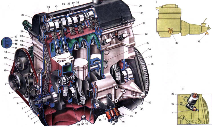 На автомобилях ВАЗ-2107. -21072. -21074 установлены четырехцилиндровые, четырехтактные карбюраторные двигатели 2103, 2105 и 2106 с различным объемом цилиндров (см. "Техническая характеристика автомобилей")- Двигатель 2105. имеющим ременный привод распределительного вала, применяется только на автомобилях ВАЗ-21072, которых выпускается незначительное количество. Поэтому в данном альбоме он не описывается, а с его устройством можно ознакомиться по альбому "Автомобили ЬАЗ-2105. ВАЗ2104". Двигатели 2103 и 2106, которые описываются ниже, отличаются друг от друга блоком цилиндров и поршнями с поршневыми кольцами. Компоновка двигателей отличается простотой и удобством обслуживания. Все узлы двигателя, требующие регулировки и ухода (распределитель зажигания, свечи, карбюратор, воздушный фильтр, регулировочные винты рычагов привода клапанов, гайка натяжителя цепи, масляный фильтр, генератор), установлены в легкодоступных местах. Нумерация цилиндров ведется от шкива привода генератора и водяного насоса. С левой стороны головки цилиндров около нижней ее плоскости отлит номер каждого цилиндра, а также порядок работы цилиндров (1-3-4-2). Цилиндры двигателя объединены вместе с верхней частью картера и представляют собой единую отливку - блок цилиндров. При такой компоновке обеспечивается прочность конструкции, жесткость, компактность, надежность и уменьшается масса двигателя. В нижней части блока цилиндров на пяти опорах установлен коленчатый вал. Передний и задний концы коленчатого вала уплотняются самоподжимными резиновыми сальниками. В каждом цилиндре двигателя имеется по одному впускному и одному выпускному клапану. Поршни 15 имеют по два компрессионных кольца 16 и 17 и одно маслосъемное 14 с пружиной. Соединен поршень с шатуном поршневым пальцем 33, запрессованным в верхнюю головку шатуна. Распределительный вал 27 установлен на головке цилиндров в корпусе 26 и приводится во вращение от коленчатого вала двухрядной роликовой цепью 20. Достоинством привода являются простота конструкции и меньшая масса по сравнению с другими видами передач. Блок цилиндров 18 является базовой деталью двигателя и служит для установки и крепления механизмов, аппаратов и вспомогательных агрегатов двигателя. Блок отлит из специального низколегированного чугуна. Протоки для охлаждения двигателя сделаны по всей высоте цилиндров, что улучшает охлаждение поршней и поршневых колец и уменьшает деформации блока от неравномерного нагрева. Для повышения жесткости нижняя плоскость опущена на 50 мм ниже оси коленчатого вала. Цилиндры блока по диаметру подразделяются на пять классов через 0,01 мм, обозначаемых буквами А. В, С, D, Е: Диаметр цилиндра двигателя 2103, мм 76.00076.010 76.010-76,020 76,020-76,030 76.030-76.040 76.040-76.050 Диаметр цилиндра двигателя 2106 и 2105, мм 79,000-79,010 79,010-79,020 79,020-79, 030 79.030-79.040 79.040-79.050 Класс цилиндра указан на нижней плоскости блока против каждого цилиндра. Цилиндр и сопрягающий с Нил поршень должны иметь одинаковый класс. При ремонта цилиндры могут быть расточены и хонингованы под увеличенный диаметр поршней (на 0.4-0,8 мм) с учетом обеспечения зазора между поршнем и цилиндром 0,05-0,07 мм Для обеспечения ремонта кривошипно-шатунного механизма выпускаются детали ремонтных размеров поршни и поршневые кольца, увеличенные по диаметр) на 0,4 и 0,8 мм; вкладыши коренных и шатунных подшил инков для шеек коленча