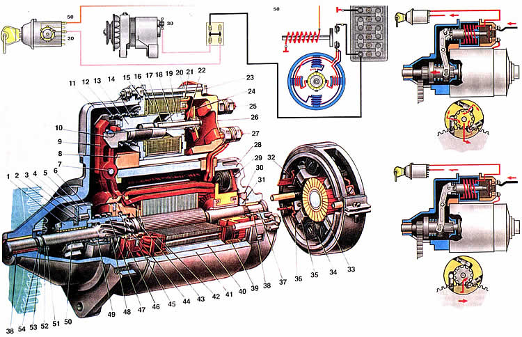 Для пуска двигателя применяется стартер СТ-221 мощностью 1,3 кВт, с электромагнитным включением шестерни привода, с роликовой обгонной муфтой и дистанционным управлением. С 1986 г. на автомобилях устанавливается взаимозаменяемый стартер 35.3708 с двухобмоточным тяговым реле и торцевым коллектором. Стартер СТ-221 представляет собой четырехшеточный, четырехполюсный электродвигатель постоянного тока со смешанным возбуждением и состоит из корпуса 41 с обмотками возбуждения, якоря с приводом, двух крышек 11 и 28 и тягового электромагнитного реле. Крышки и корпус стянуты в единое целое двумя шпильками, ввернутыми в крышку И. Внутри стального корпуса закреплены винтами четыре полюса 40. На полюсы надеты катушки обмотки. Корпус вместе с полюсами и катушками образует статор стартера. Две катушки обмотки статора являются сериесными, т.е. соединены с обмоткой якоря последовательно, а две другие шунтовыми, присоединенными параллельно обмотке якоря. Поэтому возбуждение стартера и называется смешанным. Оно обеспечивает сравнительно низкую частоту вращения якоря на холостом ходу без нагрузки, что уменьшает износ втулок подшипников вала якоря, облегчает условия работы обгонной муфты и предотвращает разнос якоря. Якорь стартера состоит из вала 37, сердечника с обмоткой 42 из медной ленты и коллектора 33, выполненного в виде пластмассовой втулки с залитыми в ней медными пластинами. Вал якоря вращается в двух металлокерамических втулках 38, запрессованых в крышки стартера и пропитанных маслом. Осевой свободный ход вала якоря регулируется подбором шайб 54 и должен быть в пределах 0,07-0.7 мм (у стартера 35.3708 - не более 0,5 мм). На переднем конце вала якоря установлен привод стартера, состоящий из роликовой обгонной муфты и шестерни 1. Назначение обгонной муфты - передавать крутящий момент от вала якоря стартера к венцу маховика при пуске двигателя, а после пуска, работая в режиме обгона, не допускать передачи крутящего момента от маховика на якорь. Иначе может произойти выброс обмотки якоря из пазов сердечника из-за "разноса" чрезмерно высокой частоты вращения якоря маховиком работающего двигателя. Обгонная муфта состоит из наружного кольца 5 с роликами 3 и внутреннего кольца, объединенного с шестерней 1 привода. Наружное кольцо имеет три паза с отверстиями, в которых находятся стальные ролики с пружинами, плунжерами и направляющими стержнями. Лазь для роликов - с переменной шириной. В широкой части паза ролики могут свободно вращаться, а в узкой - заклиниваются между наружным и внутренним кольцами. Электромагнитное тяговое реле стартера служит для ввода шестерни привода в зацепление с венцом маховика и для замыкания цепи питания обмоток якоря и статора. Магнитную систему реле образуют фланцы 15 и 20, ярмо (окружающее обмотку) и сердечник 19, запрессованный во фланец 20. На каркасе из латунной трубки и пластмассовых щек намотана катушка реле. На стартерах выпуска 1981 г. имеется две обмотки: удерживающая и втягивающая. Обе обмотки намотаны в одну сторону. Начала обмоток припаяны к штекеру "50". Конец удерживающей обмотки приварен к фланцу 20 реле (т.е. соединен с "массой"), а конец втягивающей обмотки соединен с нижним контактным болтом 27 реле. Стартер 35.3708 отличается от стартера СТ-221 применением торцевого коллектора и обмотками статора. Торцевой коллектор выполнен в 
