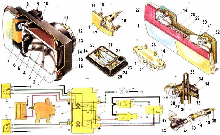 Фары. На автомобилях ВАЗ-2107 устанавливаются две блокфары правая и левая, объединяющие в себе фары, боковые указатели поворота и габаритные огни. Блок-фары могут быть установлены как отечественного производства, так и производства ЧССР. Они имеют одинаковые размеры и характеристики, но несколько различаются конструкцией. Ниже описаны блок- фары производства ЧССР. Конструкция блок-фар обеспечивает асимметричный пучок ближнего света, отвечающий требованиям правип ЕЭК 60Н (Европейской Экономической Комиссии Организации Объединенных Наций). Каждая блок-фара крепится к передку кузова четырьмя винтами, которые заворачиваются в специальные пластмассовые держатели, надеваемые на кромки гнезда блок-фары. На автомобилях ВАЗ2107 ближний и дальний свет фар включается переключателем 52, расположенным на рулевой колонке, при включенном выключателе наружного освещения 50. Кроме того, оттягивая на себя длинный рычаг переключателя 52, можно получить кратковременное включение дальнего света фар как при включенном, так и при выключенном выключателе наружного освещения. Это обеспечивается тем, что напряжение на контакты световой сигнализации переключателя 52 подается непосредственно от штекера 'выключателя 51 зажигания, минуя выключатель наружного освещения 50. Чтобы не повредились контакты переключателя 52, фары включаются через дополнительные реле 47 и 48 типа 112.3*47 или 113.3747 (с 1985 г.), расположенные в монтажном блоке 46. Блок-фара имеет пластмассовый черный корпус 14. к которому спереди специальным клеем приклеен стеклянный рассеиватель 1. Сзади корпус закрыт съемным пластмассовым кожухом 11. Таким образом, внутренняя полость блок-фары изолирована от попадания пыли и влаги. В корпусе 14 установлен рефлектор 15 с лампой 2 фары и лампой 4 габаритного огня, провода от ламп 2 и 4 подведены к штепсельной колодке, установленной на задней стороне корпуса блок-фары. С внешней стороны блок- фары имеется параболическое гнездо, в которое вставляется патрон с лампой *бокового указателя поворота. Это гнездо закрыто пластмассовым оранжевым рассеивателем 7. Рефлектор 15 фары - стальной прямоугольный. Его отражающая поверхность имеет форму параболоида большого диаметра, ограниченного сверху и снизу горизонтальными плоскостями. Параболоид концентрирует отраженные лучи света в пучок, направляя его вдоль своем оси, если нить лампы находится в фокусе параболоида. Благодаря увеличенному горизонтальному диаметру, прямоугольный рефлектор обеспечивает большие углы рассеивания светового потока в горизонтальном направлении. Поэтому при ближнем свете лучше освещается правая сторона дороги и уменьшается световой поток в направлении глаз водителей встречного транспорта, что повышает безопасность движения. Для создания зеркальной поверхности отражающая поверхность рефлектора покрыта лаком, а затем тонким слоем алюминия. Такое покрытие отражает от 90% падающего на него света. Рассеиватель 1 выполнен из бесцветного стекла с высокой степенью прозрачности. Его наружная поверхность гладкая, а на внутренней имеется система призм и линз, разворачивающих части светового пучка в горизонтальном направлении и концентрирующих световой поток в наиболее ответственных точках дороги. (5 тыльной стороны в рефлектор вставляется лампа 2. Лампа галогенная, т.е. в ее колбе находятся 