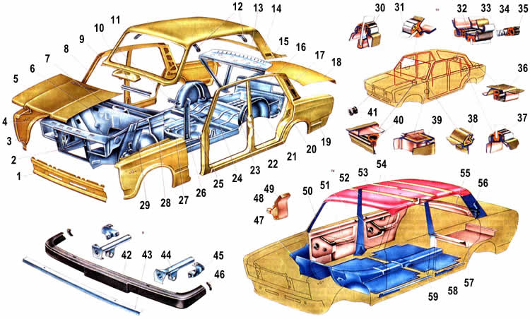 Кузов автомобиля типа "седан", несущей конструкции, цельнометаллический, сварной. Передние сиденья анатомические, с регулировкой наклона спинок. Для удобной посадки водителя и переднего пассажира передние сиденья могут перемещаться вдоль автомобиля. Заднее сиденье имеет встроенный подлокотник. Передние двери с одним опускным стеклом, задние двери с опускным и неподвижным стеклами. Ветровое и заднее стекла панорамного типа. Ветровое стекло трехслойное, полированное; заднее и боковые стекла закаленные, полированные. Все стекла безопасного типа. Кузов имеет надежную термошумоизоляцию, которая достигается за счет использования шумопоглощающих накладок с битумным слоем. Днище и внутренние полости крыльев для защиты от коррозии и шумоизоляции покрыты поливинилхлоридным пластизолем Д-1 1А. Каркас и оперение кузова. Кузов автомобиля состоит из передка, пола с усилителями, задка и деталей оперения. К силовым элементам каркаса относятся лонжероны, поперечины, стойки и другие детали. К деталям оперения кузова относятся лицевые панели кузова и навесных узлов. Все детали и узлы соединены между собой контактной точечной сваркой, а сильно нагруженные детали дополнительно приварены электродуговой сваркой. Газовой сваркой приварены панель 11 крыши с боковыми панелями 14. Передок кузова состоит из вертикального щитка передка 11. брызговиков 29 передних крыльев со стойками, поперечины 4, коробки 7 воздухопритока, поперечины 10 панели приборов и боковых панелей 28 передка. Пол кузова включает панели переднего и заднего полов, полов багажного отделения, запасного колеса и топливного бака. С панелями полов сварены передние лонжероны 2, лонжероны переднего пола, соединители центральных стоек, средние лонжероны, лонжероны 20 заднего пола, поперечины 27. 24. 23 и 17, кронштейн поперечной штанги задней подвески и другие детали. Задок кузова состоит из внутренних и наружных арок задних колес, внутренних боковых панелей крыши, рамки задней перегородки с полкой 15. Оперение кузова включает лицевые детали: передние и задние крылья 3 и 19, панель 11 крыши, боковины 8, боковые панели 14 крыши, раму 9 ветрового стекла, раму 13 заднего окна, панель 1 облицовки передка, панель 16 задка. На кузов на петли навешены капот, двери, крышка багажника, передний и задний бамперы, облицовка радиатора и другие детали. Все основные детали кузова отштампованы из листовой малоуглеродистой стали. Наружные основные панели изготовлены из стали толщиной 0,7 мм; передний пол и панель крыши - 0,9 мм; брызговики передних крыльев, арки задних колес, лонжероны и поперечины полов - 1,00 мм; сильно нагруженные детали - 1.5 мм (передние лонжероны, центральные стойки и другие). Различные мелкие детали кузова (усилители, соединители, кронштейны, надставки) отштампованы из стали толщиной 0,8-2.5 мм. Бамперы 42 изготовлены из поликарбоната или морозостойкого полипропилена черного цвета с тиснением лицевых поверхностей. Сверху бампер закрыт стальной накладкой 43, которая закреплена на бампере тремя шпильками и четырьмя болтами крепления бампера к удлинителям. Бамперы в сборе с удлинителями закреплены на кузове в четырех точках: удлинителями 44 к внутренним кронштейнам 45 кузова и концами к боковым кронштейнам с внутренней стороны. Трубчатые удлинители 44 имеют приварные проушины для буксировки автомобилей. Гер