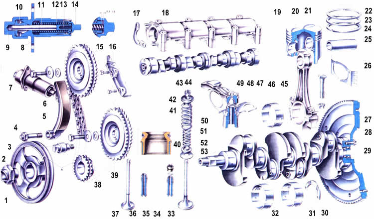 Энергия расширения продуктов сгорания топлива через кривошипно-шатунный механизм двигателя передается на коленчатый вал двигателя. Детали кривошипно-шатунного механизма при этом подвергаются воздействию значительных механических и термических нагрузокПодбор материалов поршня, пальца, поршневых колец и их конструкция обеспечивают надежное уплотнение цилиндра, эффективный теплоотвод, малую массу деталей, минимальный коэффициент трения, высокую прочность и надежность. Поршни 21 изготовлены из алюминиевого сплава и покрыты слоем олова для улучшения прирабатываемости. Юбка поршня в поперечном сечении овальная, причем большая ось овала перпендикулярна оси поршневого пальца- По высоте поршень имеет коническую форму: в верхней части меньший диаметр. чем в нижней. Кроме того, в бобышки поршня залиты стальные пластины 20. Все это выполнено для компенсации неравномерности тепловой деформации поршня при работе в цилиндрах двигателя, возникающей из-за неравномерного распределения массы металла внутри юбки поршня. В бобышках поршня имеются отверстия для прохода масла к поршневому пальцу. Отверстие под поршневой палец смещено от оси симметрии на 2 мм в правую сторону двигателя. Это уменьшает возможность появления стука поршня при переходе через верхнюю мертвую точку. Для правильной установки поршня в цилиндр около отверстия под поршневой палец имеется метка "П". Поршень устанавливают в цилиндр так, чтобы метка была обращена в сторону передней части двигателя. Поршни подразделяются на пять классов через 0,01 мм, и индивидуально подбираются по наружному диаметру к каждому цилиндру, а по диаметру отверстия под поршневой палец - на три категории через 0,004 мм. Класс поршня (буква) и категория отверстия под поршневой палец (цифра) клеймятся на днище поршня. Поршни по массе в одном и том же двигателе подобраны с максимально допустимым отклонением +2,5 г. На рисунке изображен поршень от двигателя 2103. Поршни двигателя 2105 имеют номинальный диаметр 79 мм и две наклонные выемки на днище под клапана- Поршни двигателей 2106 тоже имеют диаметр 79 мм и одну цилиндрическую выемку диаметром 55 мм и глубиной 1,9 мм. Поршневой палец 25 - стальной, цементированный трубчатого сечения, запрессован в верхнюю головку шатуна с натягом и свободно вращается в бобышках поршня. Поршневые пальцы, как и отверстия в бобышках поршня по наружному диаметру, подразделяются на три категории через 0,004 мм. Категорию пальца (цифра) помечают на его наружной поверхности или торец пальца окрашивают в соответствующий цвет: синий - первая категория, зеленый - вторая, красный - третья. Собираемые палец и поршень должны принадлежать к одной категории. Поршневые кольца 22. 23, 24, обеспечивающие необходимое уплотнение цилиндра, изготовлены из чугуна. На поршне установлены два компрессионных (уплотняющих) кольца, которые уплотняют зазор между поршнем и цилиндром и отводят тепло от поршня, и одно маслосъемное, которое препятствует попаданию масла в камеру сгорания. Кольца прижимаются к стенке цилиндра силами собственной упругости и давлением газов. Верхнее компрессионное кольцо 22 работает в условиях высокой температуры, агрессивного воздействия продуктов сгорания и недостаточной смазки, поэтому для повышения износоустойчивости наружная поверхность его хромирована и для улучшения пр