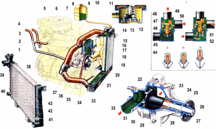 Система охлаждения служит для охлаждения нагревающихся деталей и поддержания нормального температурного режима двигателя. Система охлаждения жидкостная, закрытого типа, с принудительной циркуляцией. Вместимость системы 9.85 л (двигатели с алюминиевыми радиаторами имеют меньшую вместимость). Система охлаждения состоит из насоса 36. радиатора, расширительного бачка 8, неразборного термостата 38. четырехлопастного электровентилятора, рубашек охлаждения блока и головки блока цилиндров, трубопроводов, шлангов и сливных пробок. Система заполняется жидкостью Тосол А-40 - водным раствором антифриза Тосол-А (концентрированного раствора этиленгликоля с антикоррозионными и антивспенивающими присадками, исключающими образование накипи и коррозии деталей, плотностью 1,12-1,14 г/см). Тосол А-40 имеет плотность 1, 078-1,085 г/см и температуру начала кристаллизации минус 40 С. Уровень жидкости при холодном двигателе должен быть на 3-4 см выше метки "MIN" на полупрозрачном расширительном бачке. Доливать в расширительный бачок необходимо дистиллированную воду или антифриз Тосол-А в зависимости от плотности охлаждающей жидкости в системе. Проверка плотности жидкости осуществляется ареометром при техническом обслуживании автомобиля. Для контроля температуры охлаждающей жидкости имеются датчик, установленный в головке цилиндров, и указатель на щитке приборов. При нормальном тепловом режиме работы двигателя стрелка указателя стоит у начала красного поля шкалы в пределах 80 – 100 C. Повышенный тепловой режим двигателя может быть вызван неполадками в системе охлаждения (недостаточное количество охлаждающей жидкости, ослабление натяжения ремня привода насоса, неисправность термостата) или тяжелыми условиями движения (движение по песку, крутому затяжному подъему, буксировка и т.д.). Слив жидкости из системы охлаждения осуществляется через сливные отверстия, закрываемые пробками: одна в левом углу нижнего бачка радиатора, другая в блоке цилиндров слева по ходу движения автомобиля. При работе двигателя нагретая в рубашке охлаждения жидкость поступает через выпускной патрубок 6 по шлангам 5 и 7 в радиатор или термостат 38 в зависимости от положения клапанов термостата, далее всасывается по шлангу 37 насосом 36 и направляется насосом снова в рубашку охлаждения. К системе охлаждения подключен отопитель салона автомобиля. Нагретая жидкость из головки цилиндров поступает по шлангу 4 через кран в радиатор отопителя, а по шлангу 3 и трубке 1 отсасывается насосом 36. Насос охлаждающей жидкости служит для обеспечения циркуляции жидкости в системе охлаждения. Насос центробежного типа. Корпус 30 и крышка 25 отлиты из сплава алюминия. Валик 27 насоса устанавливается в двухрядном шариковом подшипнике 24, который стопорится в крышке стопорным винтом 28. Чтобы винт не ослабевал, контуры гнезда стопорного винта расчеканиваются после сборки. Подшипник не имеет внутренней обоймы, роль обоймы выполняет валик насоса. При сборке подшипник заполняется смазкой Литол-24 и в дальнейшем не смазывается. На передний конец валика напрессовывается ступица 26 шкива привода насоса, на задний - крыльчатка 31. К торцу крыльчатки, закаленному токами высокой частоты на глубину 2-3 мм, прижимается упорное уплотнительное кольцо сальника, изготовленное из графитовой композиции. Сальник насоса не