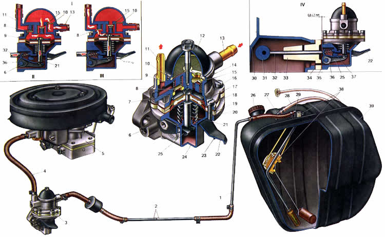 1. Задняя трубка топливного трубопровода; 2. Передняя трубка топливного трубопровода; 3. Топливный насос; 4. Шланг от топливного насоса к карбюратору; 5. Карбюратор; 6. Ось рычага механической подачи топлива; 7. Седло нагнетательного клапана; 8. Нагнетательный клапан; 9. Верхний корпус насоса; 10. Фильтр; 11. Нагнетательный патрубок; 12. Крышка насоса; 13. Всасывающий патрубок; 14. Седло всасывающего клапана; 15. Всасывающий клапан; 16. Тарелка диафрагмы; 17. Внутренняя дистанционная прокладка; 18. Верхние диафрагмы; 19. Наружная дистанционная прокладка; 20. Нижняя диафрагма: 21. Шток; 22. Рычаг ручной подкачки топлива; 23. Пружина рычага; 24. Нижний корпус насоса; 25. Балансир; 26. Пробка топливного бака; 27. Воздушная трубка топливного бака; 28. Шланг сообщения топливного бака с атмосферой; 29. Приемная труба; 30. Блок цилиндров; 31. Эксцентрик валика привода масляного насоса и распределителя зажигания; 32. Толкатель; 33. Теплоизоляционная проставка топливного насоса; 34. Прокладка теплоизоляционной проставки; 35. Прокладка топливного насоса; 36. Рычаг механического привода насоса; 37. Кулачок; 38. Датчик указателя уровня топлива; 39. Топливный бак; 40. I.Схема работы топливного насоса; 41. II.Схема установки топливного насоса.