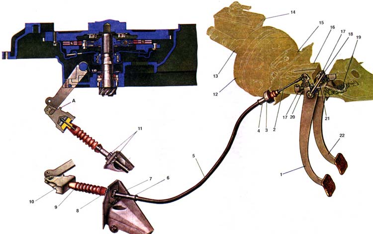 Привод сцепления механический тросовый. Педали сцепления и тормоза подвешены к кронштейну 16 на общей оси 18. Кронштейн педалей приварен к щитку передка и к коробке воздухопритока. Каждая из педалей установлена на оси на двух пластмассовых втулках, установленных в ступицах педалей. Между педалью тормоза и щекой кронштейна на оси установлена пластмассовая дистанционная втулка 21. Педаль сцепления расположена на оси между щекой кронштейна и упорной шайбой, установленной под головку оси педалей. Ось удерживается в кронштейне стопорной скобой 17. Верхний конец педали соединяется пальцем с тросом 2, который расположен в оболочке 5, по обоим концам которой закреплены наконечники. Верхний наконечник 4 расположен в резиновом буфере, а он, в свою очередь, в стальной обойме 3. Буфер упирается торцом в гнездо передка кузова, а хвостовик буфера заходит в отверстие передка, чем обеспечивается фиксация буфера в гнезде. Нижний наконечник 6 оболочки троса зажат в гнезде кронштейна 7 коробки передач двумя гайками 1-1 и фиксируется пластиной 8. Гайками И регулируется ход педали. Конец троса соединяется с поводком 10, в прорезь которого заходит крючок рычага вилки выключения сцепления. Крючок рычага охватывает палец поводка. Оголенная часть троса закрывается защитным чехлом 9. Работа сцепления. Сцепление постоянно замкнутого типа, т.е. постоянно включено. При этом педаль 1 сцепления оттягивается в исходное положение пружиной 19 до упора подшипника выключения сцепления в лепестки нажимной пружины. Ведомый диск под действием усилия нажимной пружины зажимается между поверхностями маховика и нажимного диска. За счет сил трения между поверхностями дисков крутящий момент от маховика и нажимного диска передается на ведомый диск и через детали демпфера на ступицу ведомого диска и на первичный вал коробки передач. Для выключения сцепления нажимают на педаль 1, которая поворачивается на оси 18 и верхним плечом тянет за собой трос. Перемещаясь в оболочке, трос через поводок и рычаг поворачивает вилку выключения сцепления. Вилка перемещает по направляющей втулке муфту с подшипником выключения сцепления, который давит на лепестки нажимной пружины, и она прогибается на опорных кольцах кожуха. При этом наружная кромка пружины перестает давить на нажимный диск и ведомый диск немного отходит от поверхности маховика. Передача крутящего момента на ведомый диск прекращается. Вследствие беззазорного привода уменьшается полный ход педали сцепления и обеспечивается более четкое выключение сцепления, за счет чего улучшаются условия работы синхронизаторов коробки передач. Когда педаль отпускают, то она под усилием пружины 19 возвращается в исходное положение, и подшипник выключения сцепления перестает давить на лепестки нажимной пружины, поэтому она принимает свою первоначальную форму. Оказывая давление, она перемещает нажимный диск в сторону маховика. При нажатии на ведомый диск его волнистая поверхность постепенно становится плоской, позволяя сначала проскальзывать диску,- вследствие чего сцепление включается плавно. При этом крутящий момент от маховика передается на кожух и нажимной диск и за счет сил трения на ведомый диск, затем от него через детали демпфера на ступицу ведомого диска и через шлицевое соединение на первичный вал коробки передач. Крут