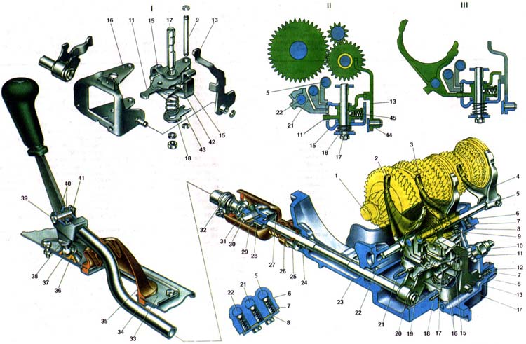 1. Вторичный вал; 2. Вилка переключения I и II передач; 3. Вилка переключения III и IV передач; 4. Вилка включения V передачи: 5. Шток вилки включения V передачи; 6. Шарик фиксатора; 7. Пружина фиксатора; 8. Крышка фиксаторов штоков переключения передач; 9. Направляющая ось блокировочной скобы; 10. Выключатель света заднего хода; 11. Трехплечий рычаг выбора передач; 12. Пробка фиксатора вилки включения заднего хода; 13. Вилка включения заднего хода; 14. Картер коробки передач; 15. Блокировочная скоба; 16. Корпус механизма выбора передач; 17. Ось рычага выбора передач; 18. Пружина рычага выбора передач; 19. Шток выбора передач; 20. Рычаг штока выбора передач; 21. Шток вилки переключения III и IV передач; 22. Шток вилки переключения I и II передач; 23. Картер сцепления; 24. Втулка; 25. Сальник штока выбора передач; 26. Защитный чехол шарнира; 27. Конический винт крепления шарнира: 28. Корпус шарнира тяги привода переключения передач; 29. Втулка шарнира; 30. Ось шарнира; 31. Наконечник шарнира; 32. Хомут тяги привода переключения передач; 33. Корпус рычага переключения передач: 34. Тяга привода переключения передач; 35. Защитный чехол тяги привода переключения передач; 36. Шаровая опора рычага переключения передач; 37. Сферический палец рычага переключения передач: 38. Рычаг переключений передач; 39. Ось рычага переключения передач: 40. Втулка оси рычага переключения передач: 41. Стопорная скоба; 42. Фиксатор рычага выбора передач; 43. Упорная шайба рычага выбора передач; 44. Шарик фиксатора рычага выбора передач; 45. Пружина фиксатора; 46. I.Детали механизма выбора передач: 47. II.Выбор заднего хода; 48. III.Выбор переднего хода.