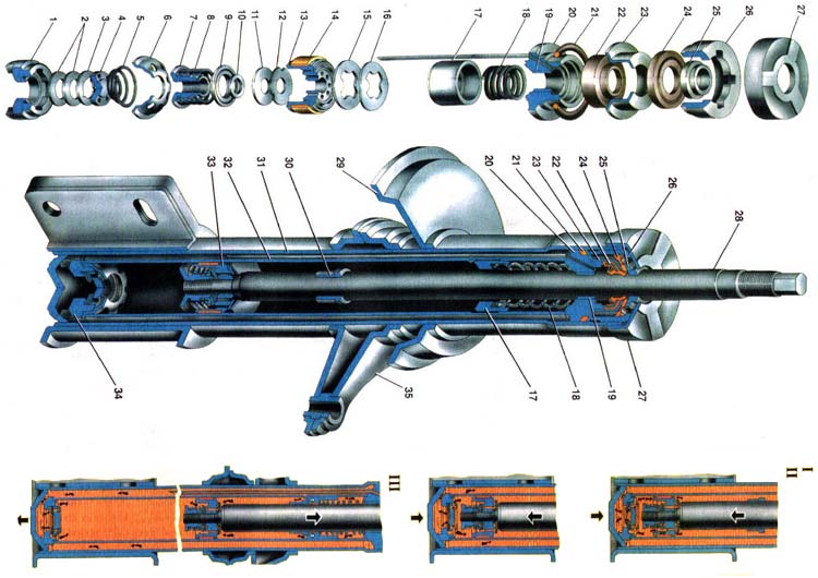 Телескопическая гидравлическая стойка является основным узлом передней подвески. Она совмещает в себе группу деталей, одни из которых выполняют функции направляющего устройства подвески, а другие гасящего элемента. К первой группе деталей относятся корпус стойки и детали ее крепления к кузову и поворотному кулаку, ко второй гидравлический амортизатор, вмонтированный в стойку. Корпус стойки 3-1 изготовлен из трубы, к нижней части которой приварено дно, а в верхней части нарезана внутренняя резьба для гайки 26. Снаружи к корпусу стойки приварены: внизу кронштейн для соединения с поворотным кулаком, в средней части опорная чашка 29 пружины подвески и поворотный рычаг 35, соединенный с тягой рулевого привода. В щеках кронштейна выполнены по два отверстия, из них верхние овальные под регулировочный болт. В корпусе стойки установлен цилиндр 32, в нижнюю часть которого запрессован клапан 34 сжатия. Его корпус поджат к дну корпуса стойки. Клапан сжатия состоит из корпуса 1, трех плоских дисков 2 и 3, тарелки 4, пружины 5 и обоймы 6. В центре корпуса выполнено гнездо с фаской, к которому прижимаются пружиной 5 диски клапана и тарелка 4. Другим концом пружина упирается в обойму 6, напрессованную на посадочный поясок корпуса клапана. Для прохода жидкости из корпуса стойки в цилиндр и обратно в нижней части корпуса выполнена цилиндрическая проточка и четыре вертикальных паза. Такие же пазы имеются и в верхней части корпуса клапана сжатия. Диски 2 клапана сжатия плоские, по центру имеют отверстия для прохода жидкости. В центральном отверстии диска 3 имеются три выреза для дросселирования жидкости при малой скорости перемещения штока. Этот диск называется дроссельным. У тарелки 4 в нижней центральной части имеется цилиндрический выступ, который перекрывает центральное отверстие дисков 2 и 3, но не закрывает дросселирующие вырезы. В собранном клапане между тарелкой 4 и диском 3 образуется зазор для прохода жидкости. С этой целью в тарелке выполнено восемь сквозных отверстий. Обойма имеет отбортовку и цилиндрический поясок, на который насаживается цилиндр. Этим самым обеспечивается герметичность между клапаном сжатия и цилиндром 32. На штампованной поверхности обоймы выполнены шесть боковых и одно центральное отверстия для прохода жидкости. В цилиндре установлен шток 28 в сборе с поршнем 33, на котором смонтированы перепускной клапан и клапан отдачи. Поршень имеет двенадцать вертикальных клапанов, расположенных по двум радиусам. Четыре канала, расположенные по большому радиусу, закрываются тарелкой 15 перепускного клапана, поджимаемой к каналам пружиной 16. Остальные клапаны перекрываются снизу пакетом из двух дисков клапана отдачи. Верхний диск 12 дроссельный, имеет три выреза по наружному диаметру. Следующий диск И плоскийОба диска поджимаются к поршню 13 пружиной 8 через опорную тарелку 9. Поршень в сборе с клапанами крепится на штоке гайкой 7, которая контрится раскерниванием штока в двух местах. Для предохранения дисков клапана отдачи от повреждений при монтаже и стабилизации работы клапана между дисками и гайкой установлена шайба 10. Поршень уплотняется в цилиндре кольцом из наполненного фторопласта, за счет чего резко увеличивается износоустойчивость пары: цилиндр поршень. На штоке напрессована, а затем приварена ограничительная втулка 30,