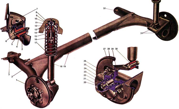 1. Ступица заднего колеса; 2. Рычаг задней подвески; 3. Кронштейн креплений рычага подвески; 4. Резиновая втулка шарнира рычага; 5. Распорная втулка шарнира рычага; 6. Болт крепления рычага задней подвески; 7. Кронштейн кузова; 8. Опорная шайба крепления штока амортизатора; 9. Верхняя опора пружины подвески; 10. Распорная втулка; 11. Изолирующая прокладка пружины подвески; 12. Пружина задней подвески; 13. Подушки крепления штока амортизатора; 14. Буфер хода сжатия; 15. Шток амортизатора; 16. Защитный кожух амортизатора; 17. Нижняя опорная чашка пружины подвески; 18. Амортизатор; 19. Соединитель рычагов; 20. Ось ступицы: 21. Колпак; 22. Гайка крепления ступицы колеса; 23. Уплотнительное кольцо: 24. Шайба подшипника; 25. Подшипник ступицы; 26. Щит тормоза; 27. Стопорное кольцо; 28. Грязеотражатель: 29. Фланец рычага подвески; 30. Втулка амортизатора; 31. Кронштейн рычага с проушиной для крепления амортизатора; 32. Резинометаллический шарнир рычага подвески.